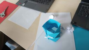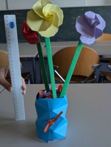 Wir wollten für diese Challenge etwas visuell Ansprechendes machen und versuchten uns an einer Blumenvase mit Blumen. Unsere Vase ist ein Rechteck mit Faltkanten welche ein Gittermuster abbilden. Zusammengehalten wird die Vase durch eine Schleife aus einem dünnen Papierstreifen. Da die Blumen mit Stiel zu schwer waren und die Vase zum umkippen brachten, haben wir die Vase mit Papierknäueln gefüllt, welche dafür sorgten, dass die Blumen nicht zu sehr kippen und alles umreißen. Als Verzierung haben wir noch zwei Mini-Blüten zu den Knäueln gelegt.