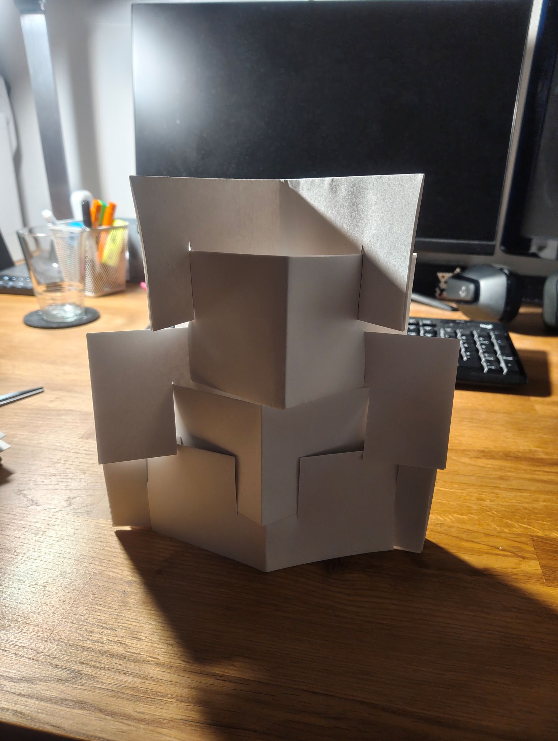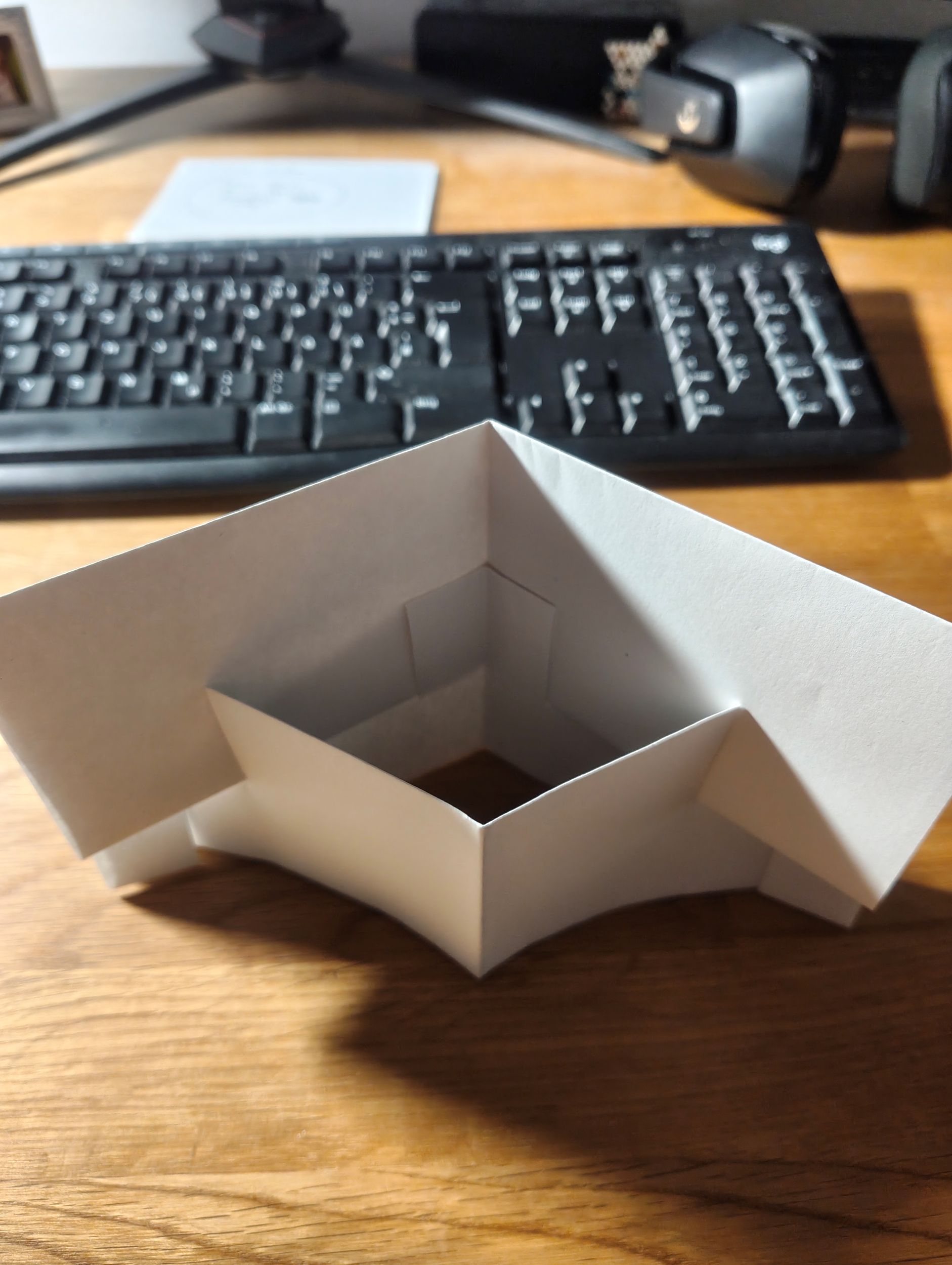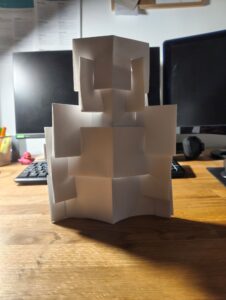 Das vorliegende Objekt basiert auf einer Vielzahl individueller Dreieckselemente. Diese wurden mittels einer präzisen Falttechnik und ineinandergreifenden Steckverbindungen (Slots) fugenlos zusammengefügt. Jedes einzelne Element trägt durch die Art der Steckverbindungen, den resultierenden Formschluss und die Eigenspannung mit den benachbarten Teilen zur Gesamtstabilität der Struktur bei.