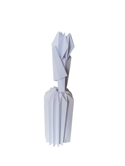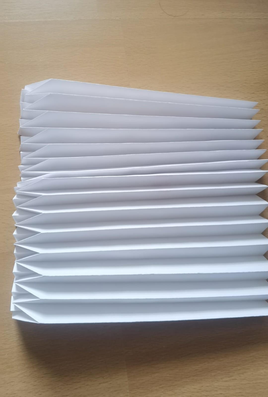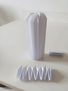 Wir haben für unseren Prototypen eines Leuchtturms zunächst die Grundtechnik des Plisseefaltung genutzt, um als Sockel eine stabile Basis zu erhalten. Darauf aufbauend haben wir für den oberen Teil die Tessellation-Falt-Technik eingesetzt, welche auf Grundlage der Plissee-Faltung gefaltet werden kann. Somit konnte auf den Sockel aufgebaut werden. Den Sockel haben wir als Zylinder geformt.