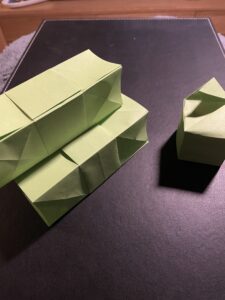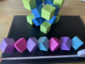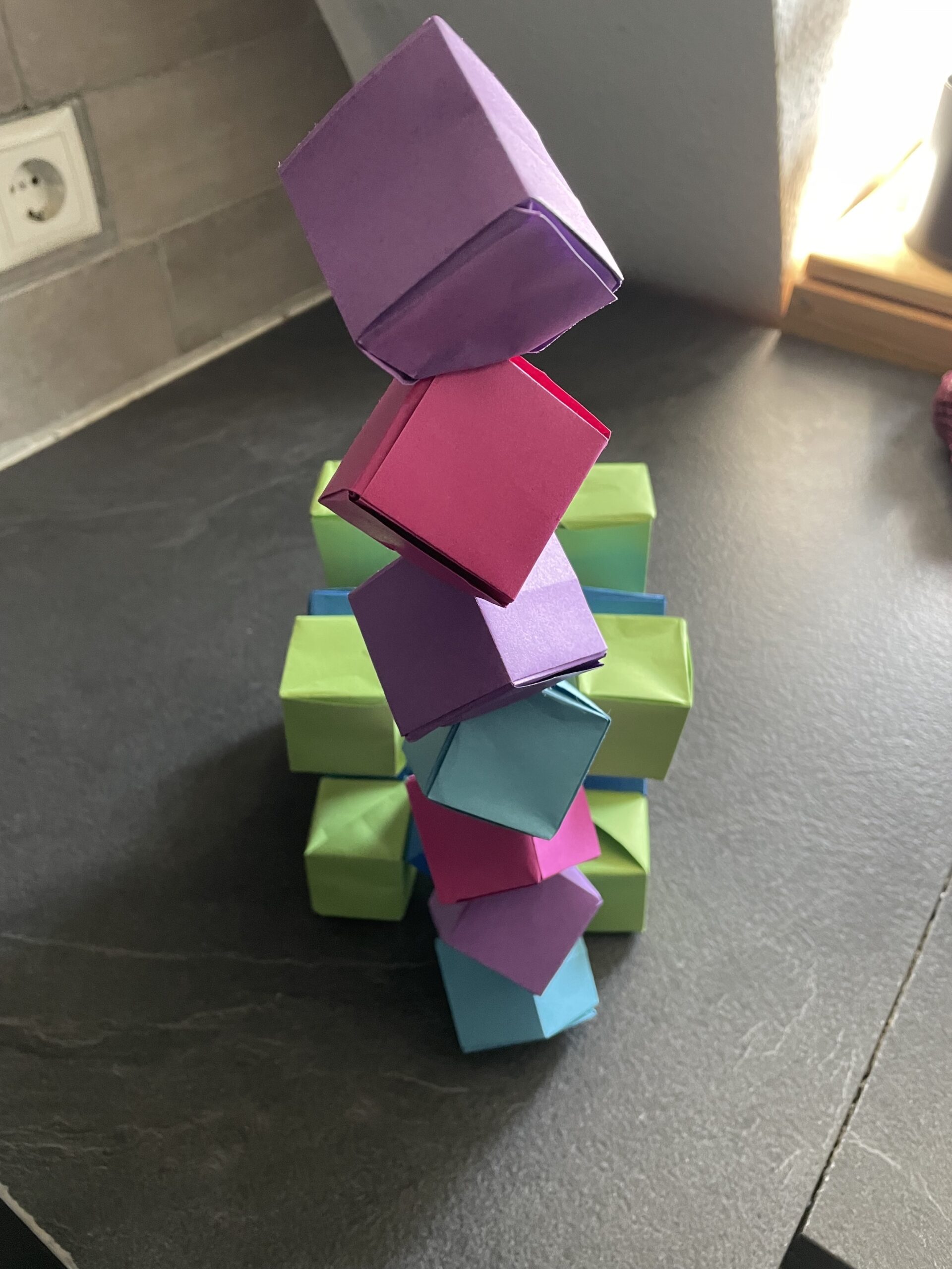 G6 – Origami – Cubes (Tower + Game) Der Cube-Tower ist 32cm hoch. – das Origami Spiel lässt sich an den entgegengesetzten Ecken als Spiel bewegen.