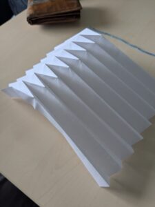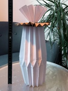 Die “Karaffe” besteht aus Pappe und wurde mithilfe von Plissee-Faltung in die gewünschte Form gebracht. Die Basis hierfür war ein weißes Rechteck. Auf diesem wurden zunächst die entsprechenden Falt-Linien angezeichnet um präzises falten zu ermöglichen. Durch verwenden von recht schwerem Papier und den Falt-Techniken bietet die Karaffe genug Stabilität um die beiden anderen Bauteile zu halten. Als Anleitung haben wir “https://fraufriemel.de/diy-vasen-aus-papier” genutzt.