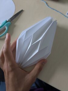 Der “Filterhalter” wurde aus einem Runden Stück Papier gefaltet bei dem in der Mitter noch ein weiterer kleiner Kreis ausgeschnitten wurde. Durch Abwechseln von Berg- und Talfaltungen entsteht die Charakteristische Optik und das Objekt bekommt die Nötige Stabilität um von alleine zu stehen.