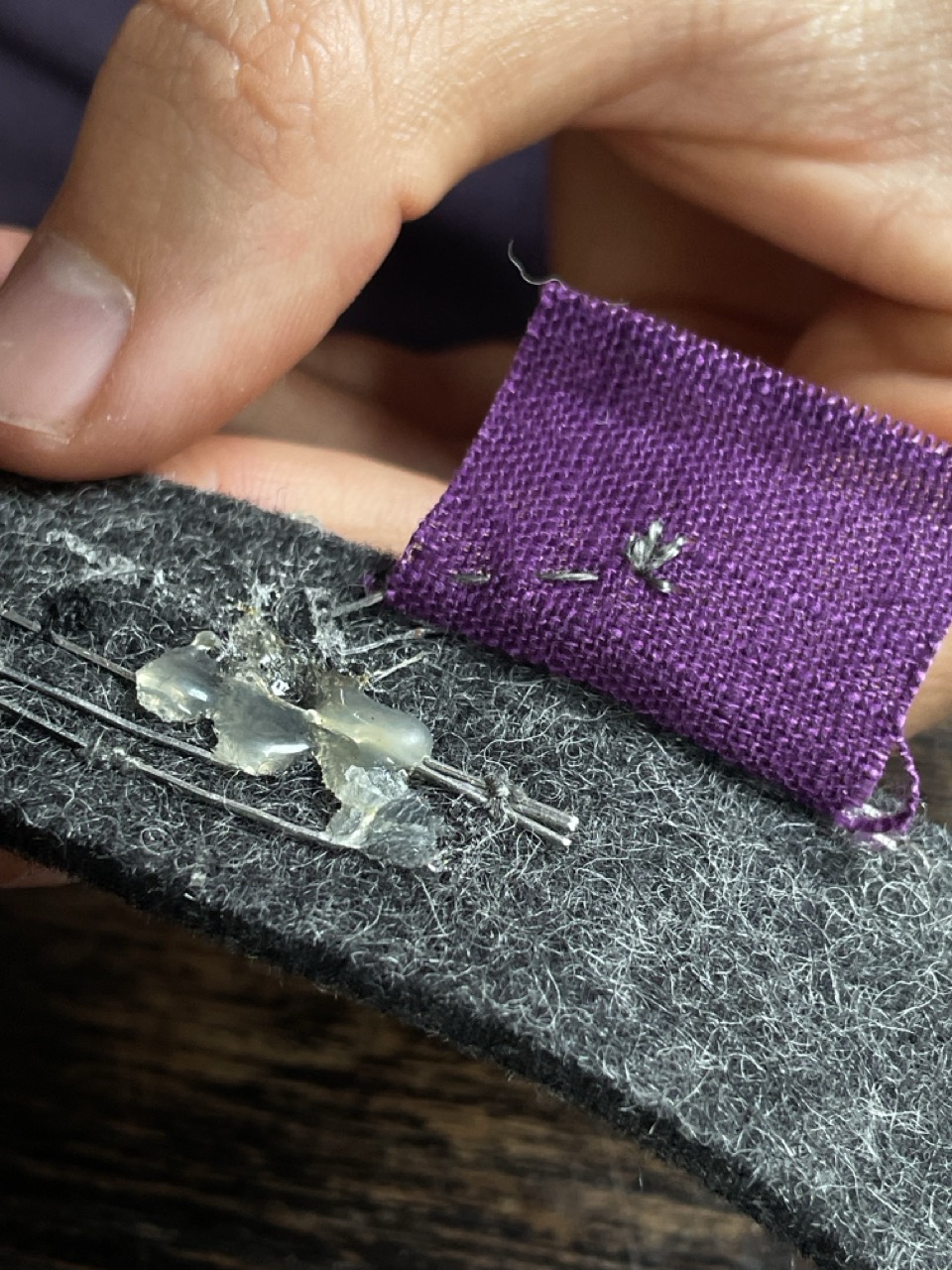 Hierfür haben wir einen Filzstreifen genommen, hier 3 LEDs in Rot, Geld und Grün durchgesteckt. Die Löcher hierfür haben wir mit einer erhitzten Nähnadel gemacht. Die Pluspole und die Minuspole haben wir voneinander getrennt und die einzelnen Minuspole zusammengeführt. Die Pluspole haben wir mithilfe von leitendem Garn an jeweils einen Druckknopf auf der Oberseite des Armbandes genäht. Hier mussten wir darauf achten, dass es keinen Kontakt zwischen den einzelnen Fäden gibt. Auf der Position der gebündelten Minuspole haben wir mithilfe eines weiteren Stoffstückes ein kleines Fach für eine 3V Knopfzelle genäht. So ist die Batterie wechselbar, falls sie leer gehen sollte. In das Stoffstück haben wir mit leitendem Garn einige Stiche gemacht, um damit den Pluspol abgreifen zu können. Durch die entsprechende Spannung des Stoffes wird die Batterie an die Minuspole gedrückt. Den Pluspol haben wir mit dem Garn auf die Oberseite geführt, wo er in einem Filzstreifen liegt, welcher mit dem Gegenstück für die Druckknöpfe als Art Schalter fungiert.