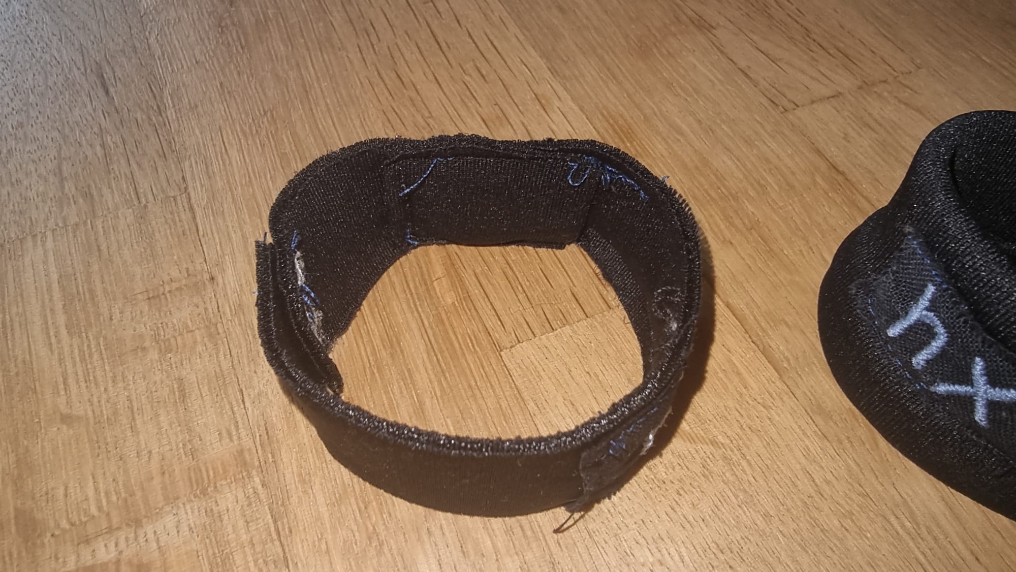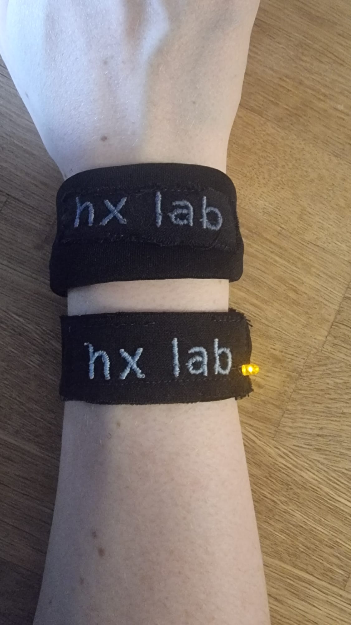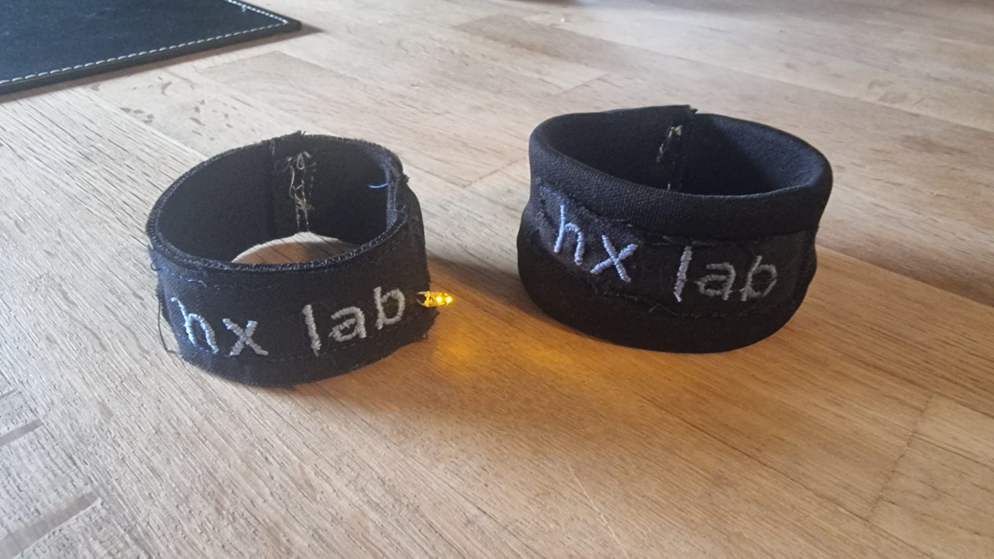 Wir hatten die Idee, Armbänder mit dem Schriftzug „hx lab“ zu besticken. Eines der beiden Armbänder besitzt anstelle des Punktes am Ende des Schriftzugs eine gelbe LED, die mit einer Knopfzellenbatterie betrieben wird. Sobald das Armband am Handgelenk getragen wird, leuchtet die LED und symbolisiert eine Glühbirne als Sinnbild für die Ideen im Lab. Das zweite Armband haben wir in einer breiteren und dickeren Ausführung gestaltet.