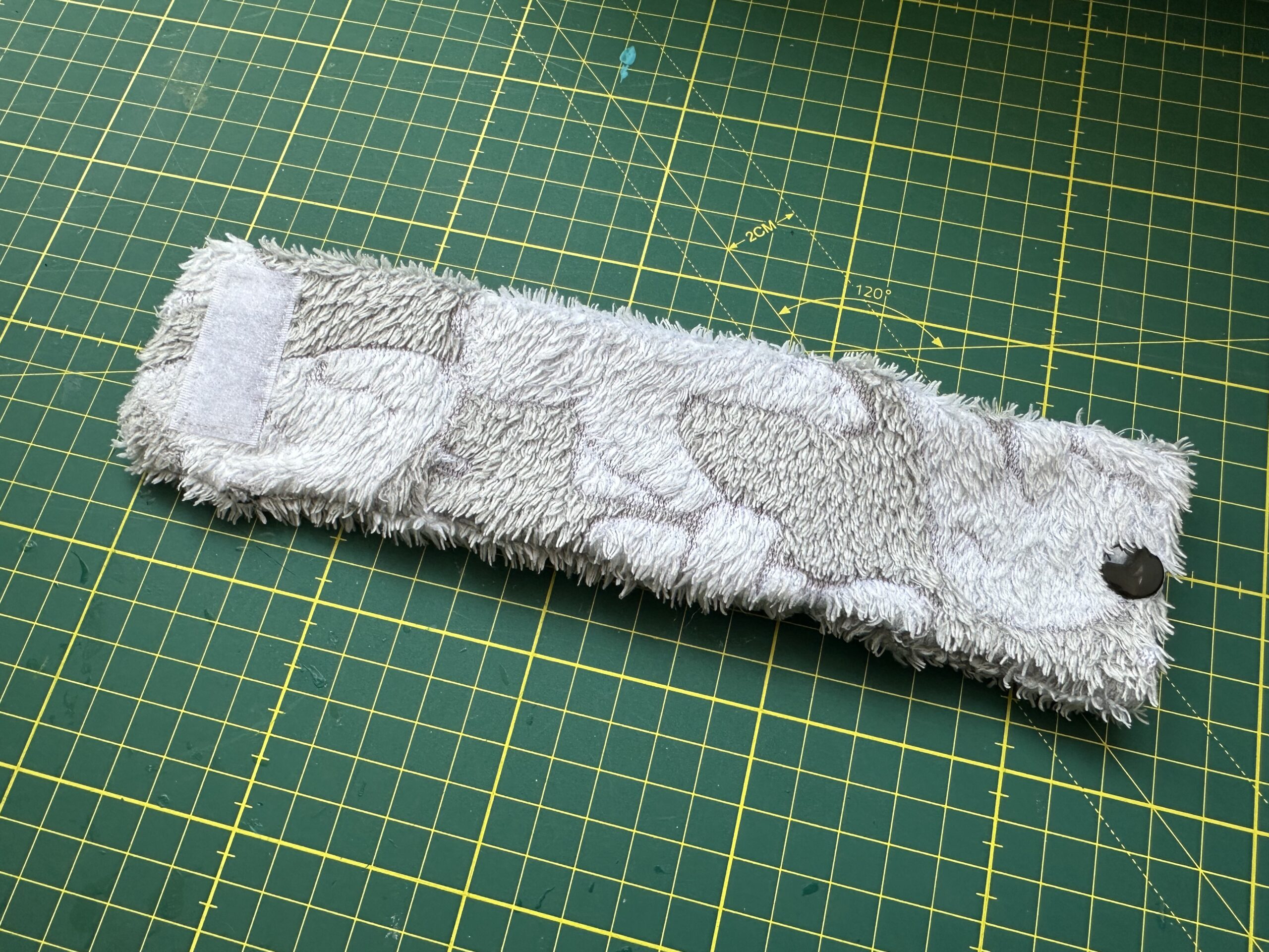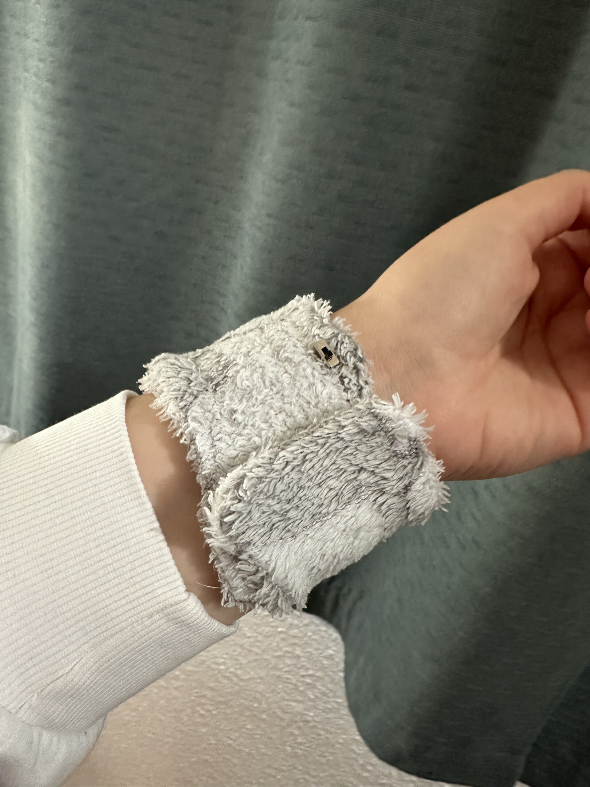 Der Stoff wurde aus einer alten Hose recycelt, zugeschnitten und vernäht. Außerdem wurde ein Klettverschluss eingenäht, um den Pulswärmer bequem an- und auszuziehen. Ein Druckknopf ermöglicht zusätzlich den Zugang zur Batterie.