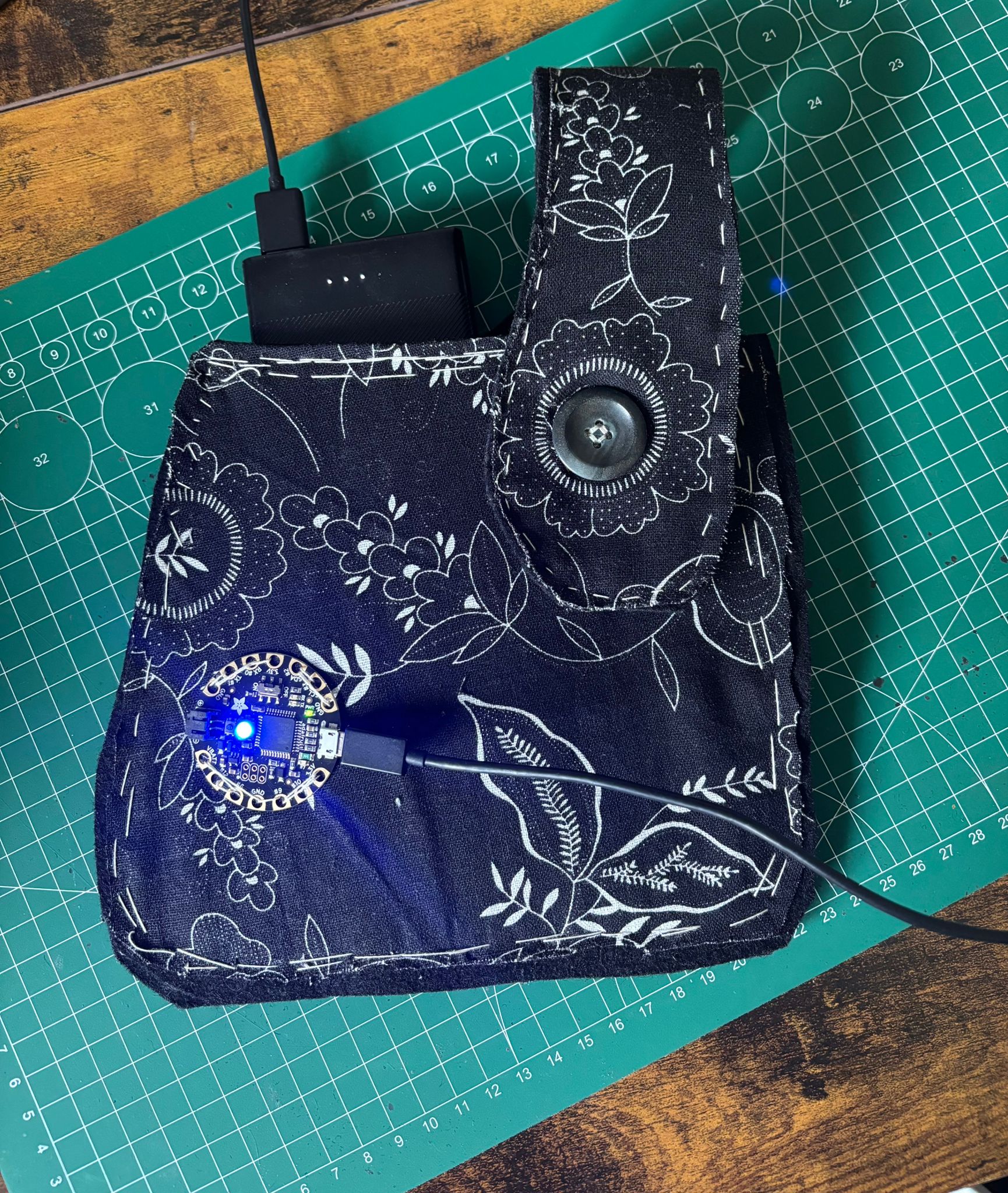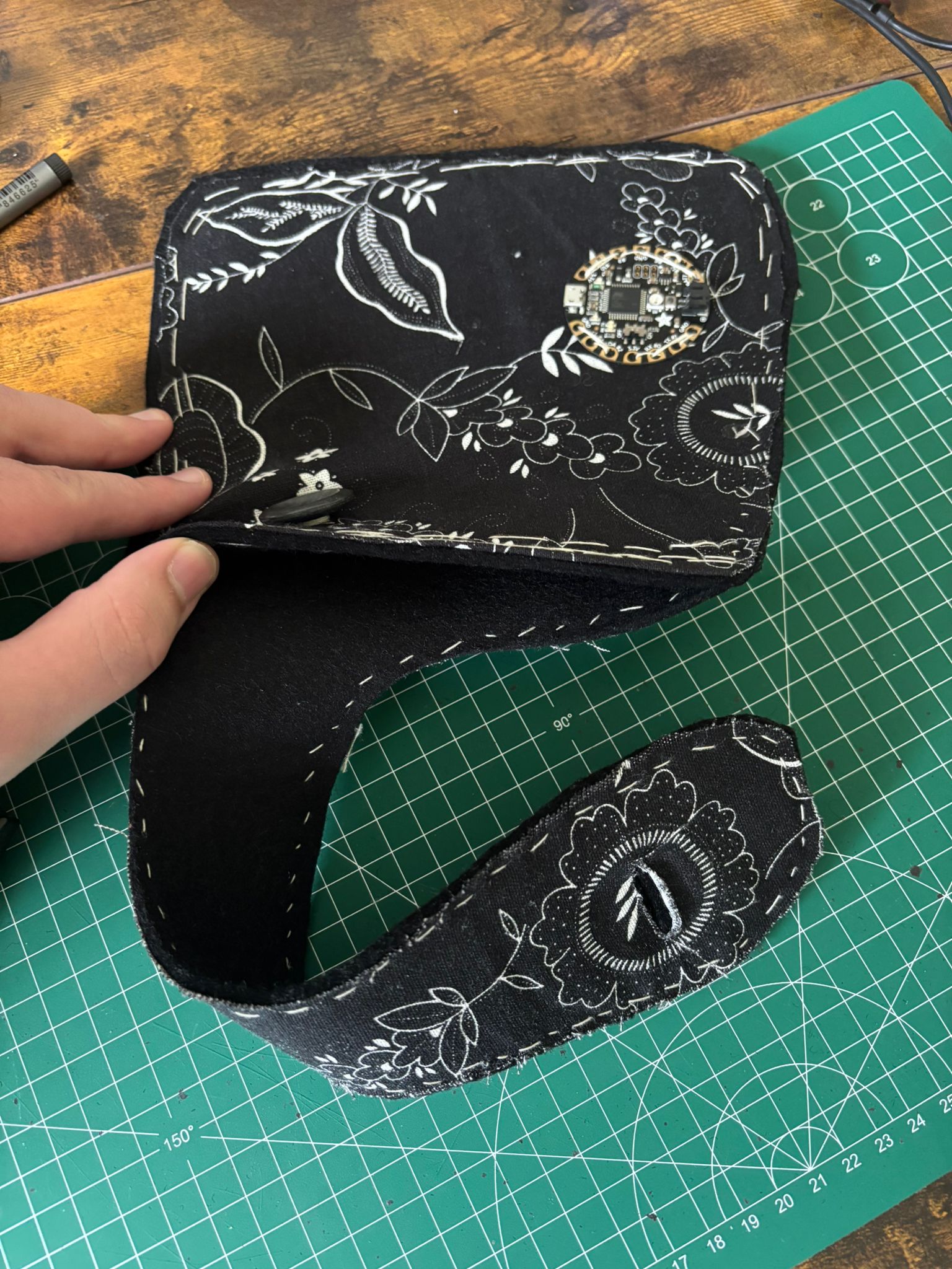 Neben der Tasche selbst wurde auch der Tragegurt mit Filz verstärkt, um einen sicheren Halt am Gürtel zu gewährleisten. Der Prototyp-Status der Tasche wird an dem Adafruit Flora deutlich, welcher hier noch mittels USB-Kabel betrieben wird und nur über Teile des nötigen Programmcodes verfügt. So funktioniert das Ansteuern der LED in verschiedenen Farben und mittels pulsierendem Signal statt Ein/Aus, aber das tatsächliche Abfangen von Push-Benachrichtigungen wurde noch nicht implementiert – ein Test zum Senden von Informationen über PC mit USB war allerdings erfolgreich.
