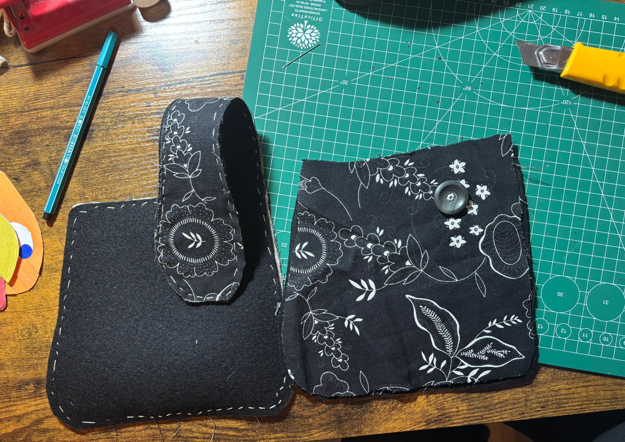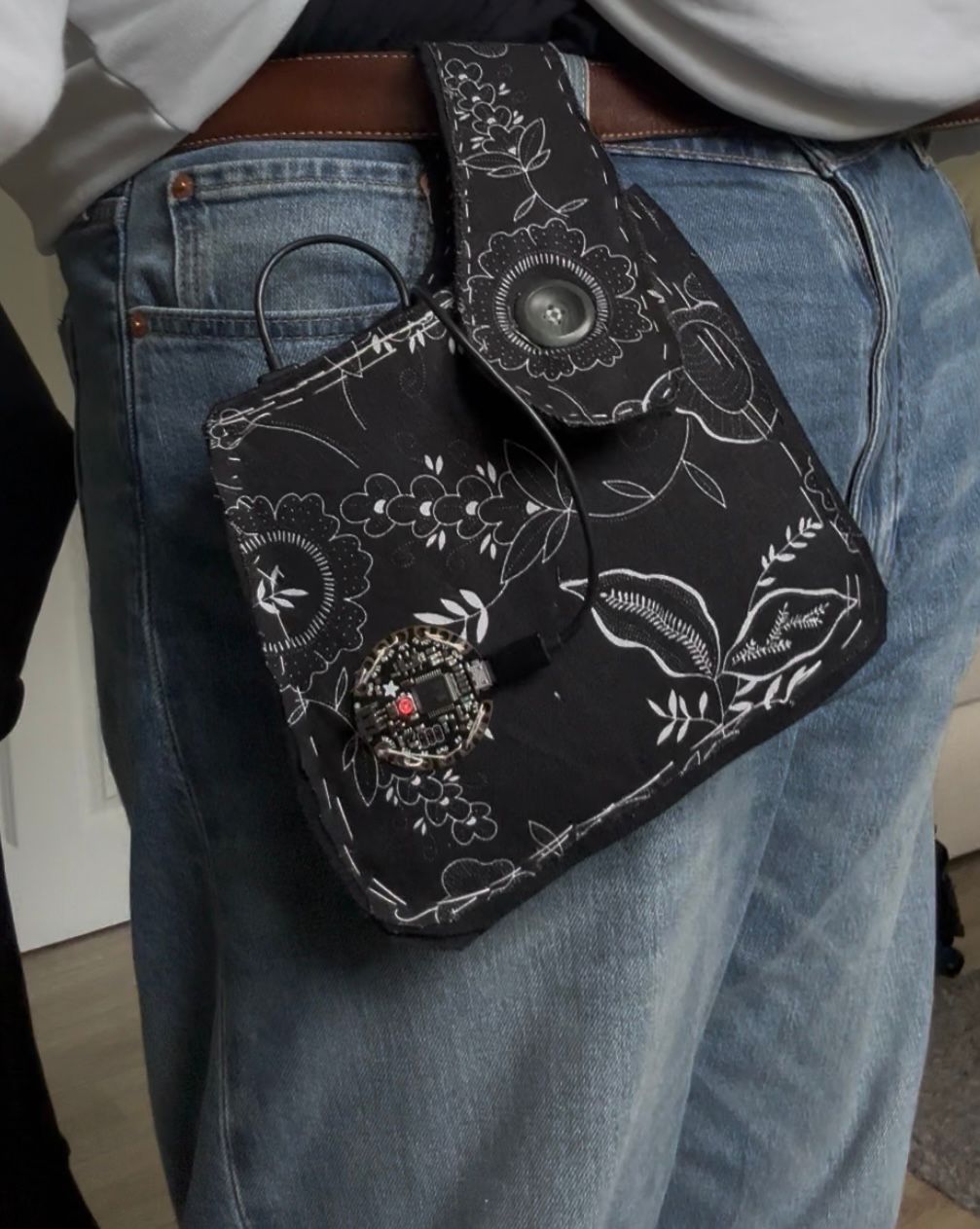 Inspiriert von diesem Post haben wir eine smarte Handytasche entwickelt, die am Gürtel getragen werden kann und mittels einer außen angebrachten LED Benachrichtigungen des Handys anzeigen soll. Um eine gute Stabilität zu erreichen, haben wir den auf den Fotos sichtbaren Stoff mit Filz vernähnt, als Recheneinheit für die LED wurde der Adafruit Flora zudem außen auf die Tasche genäht.