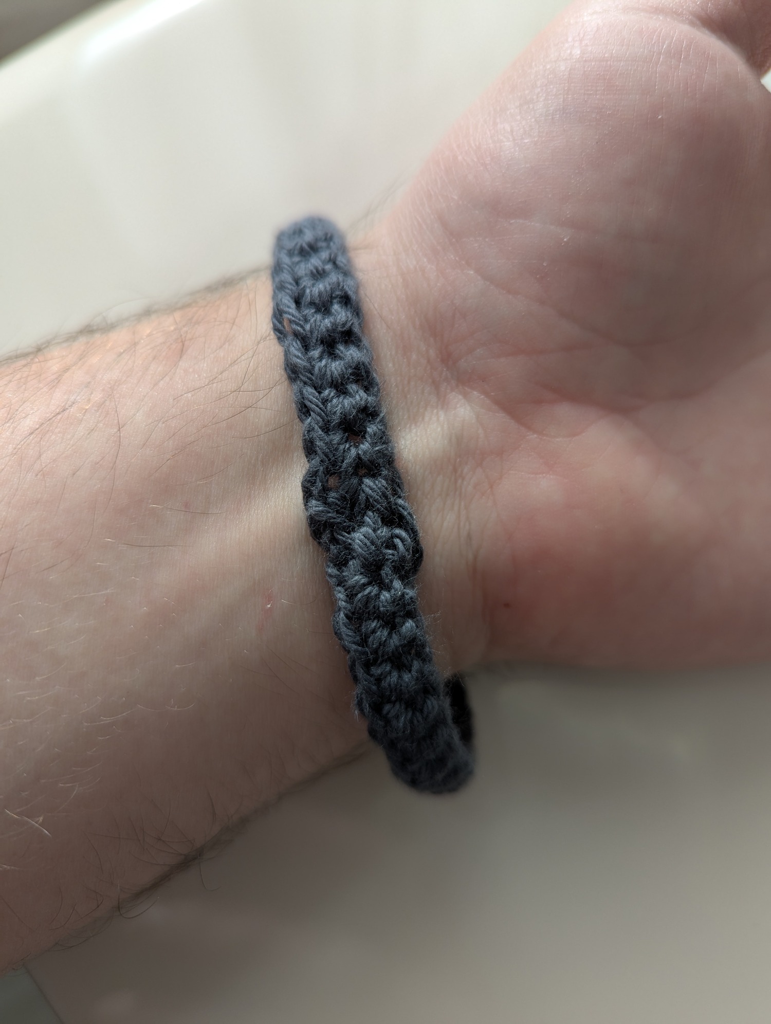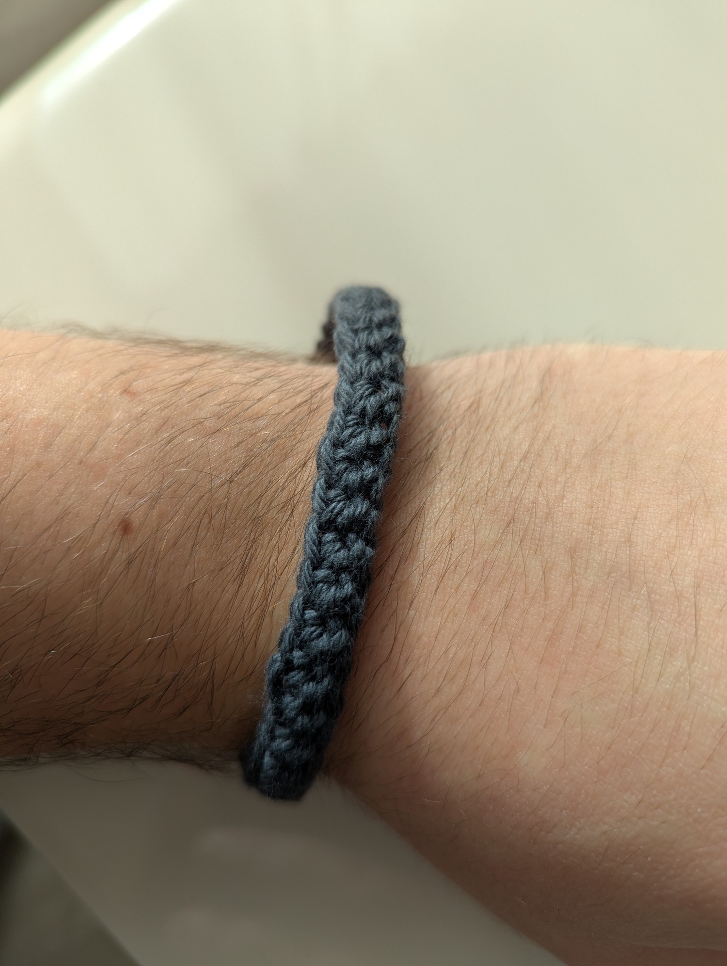 Gruppe 13: Stoffarmband Ein schmales gehäkeltes Armband um in die Kunst der Stoffverarbeitung einzutauchen. Die Idee war es sich in eine neue Textilverarbeitungstechnik einzuarbeiten. Das Armband wurde mithilfe einer Häkelnadel und Baumwolle hergestellt. Frustpotenzial als Neuling: 9/10 [ size=”medium”]