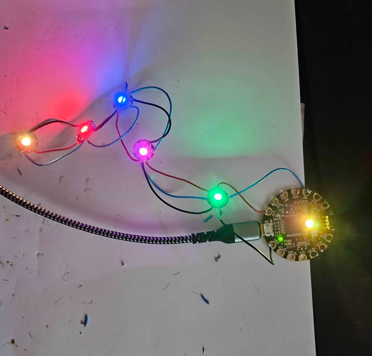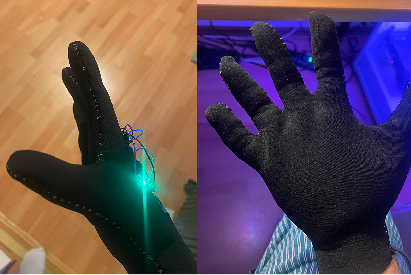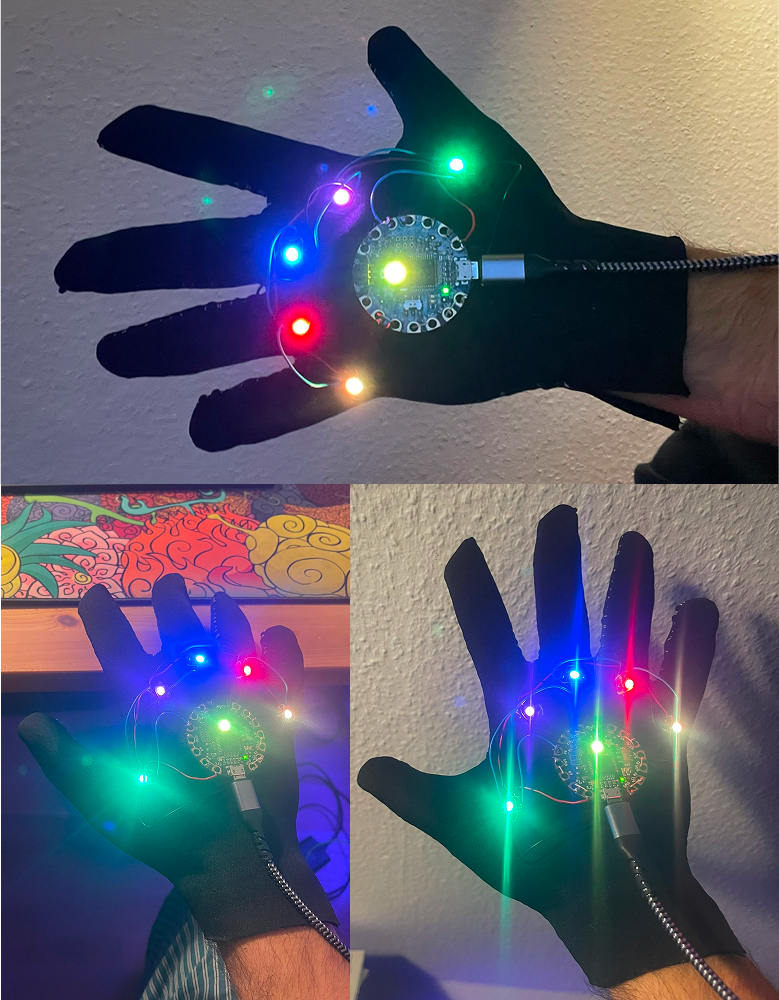 Für die Infinity Steine haben wir eine Adafruit Flora mit fünf Neopixeln verwendet. Dabei haben wir die Arduino IDE genutzt, um die passenden Farben an den Fingern zu programmieren und zu platzieren. Die Adafruit Platine wurde anschließend auf dem Handrücken befestigt und angenäht.