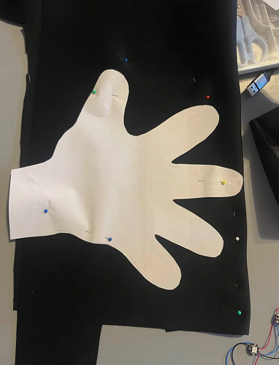 Diese Woche haben wir uns überlegt, den Thanos Handschuh zu basteln, was sehr interessant war, besonders für Neulinge, die zuvor noch nie wirklich genäht haben. Für den eigentlichen Handschuh haben wir einen neoprenartigen Stoff verwendet. Auf Papier haben wir zunächst eine Handschablone gezeichnet und anschließend zwei Handformen ausgeschnitten. Diese wurden dann von Hand zusammengenäht und auf links gedreht, sodass die Nähte nicht mehr sichtbar waren.