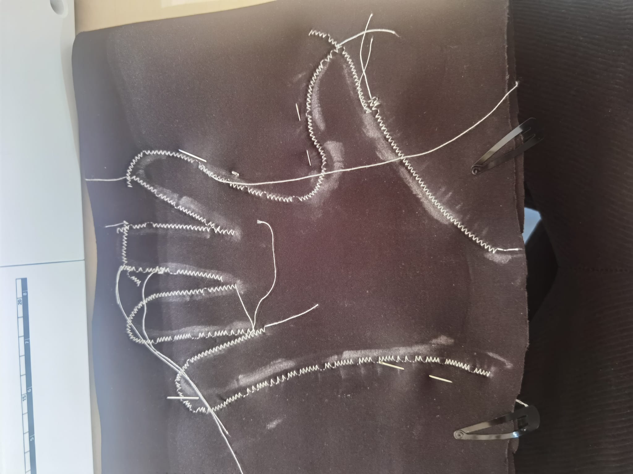 Im ersten Schritt haben wir ein Schnittmuster in einem Stück erstellt, bei dem Handfläche, Handrücken und Finger in einer Form enthalten sind. Dieses Muster diente als Grundlage für den Zuschnitt.