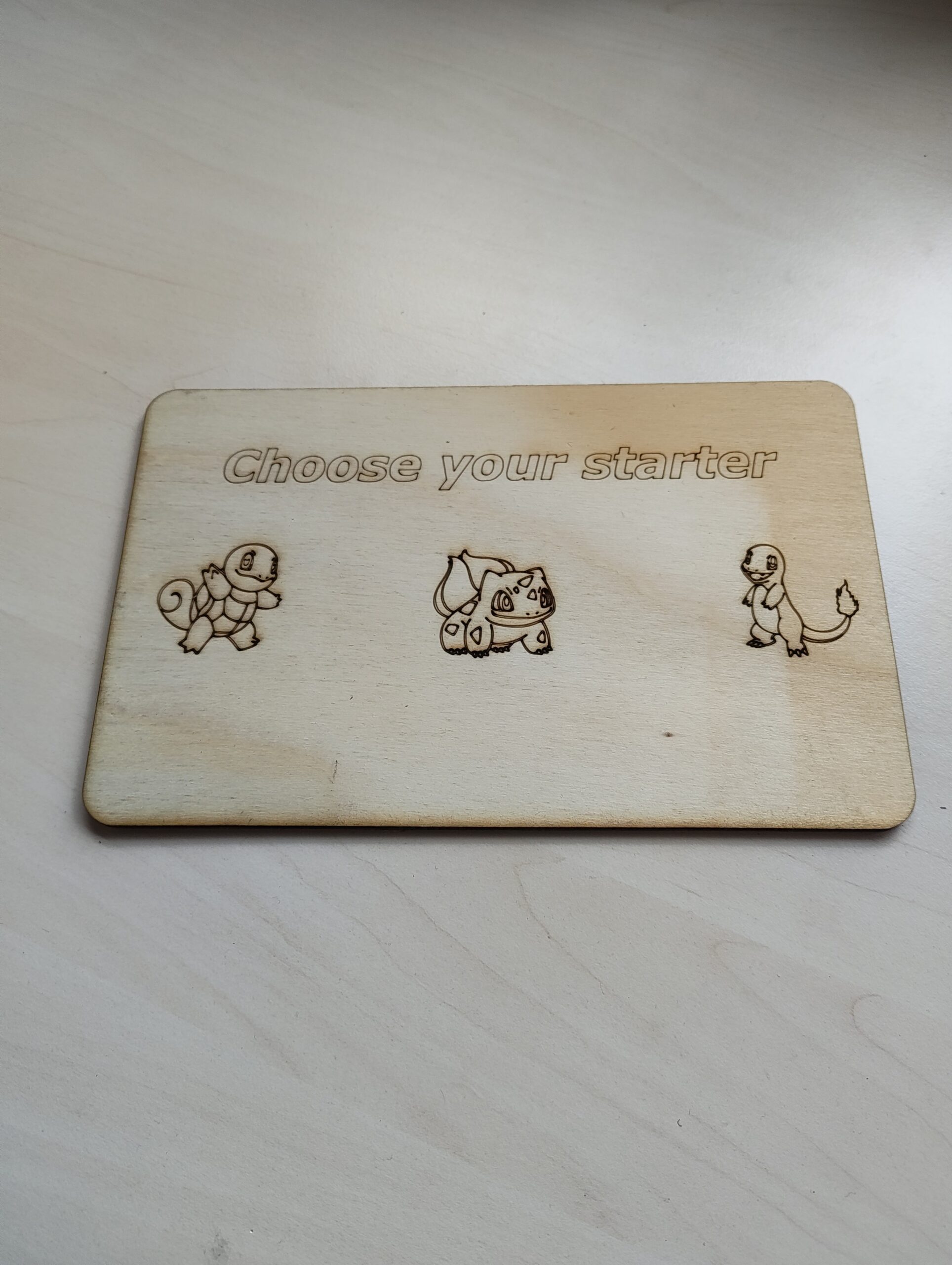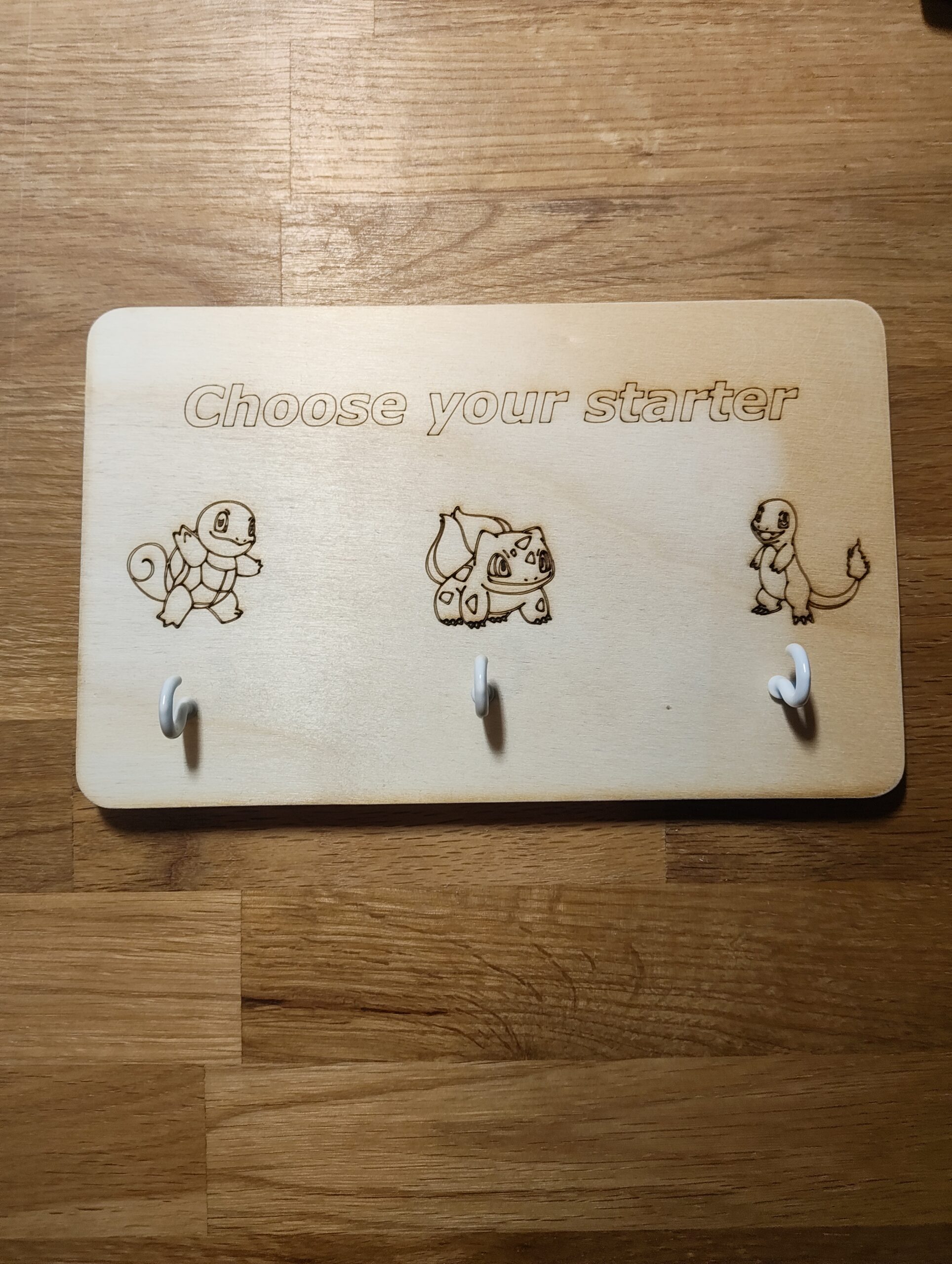 Für die dritte Aufgabe habe ich ein dekoratives Schlüsselbrett aus Holz designed, das eine Hommage an die ersten Pokémon-Spiele (Rot, Blau und Gelb) darstellt. Mit dem Lasercutter habe ich ein Brett ausgeschnitten, auf dem die drei Starter-Pokémon Schiggy, Bisasam und Glumanda eingraviert sind – inspiriert vom der ikonischen Spielereihe.