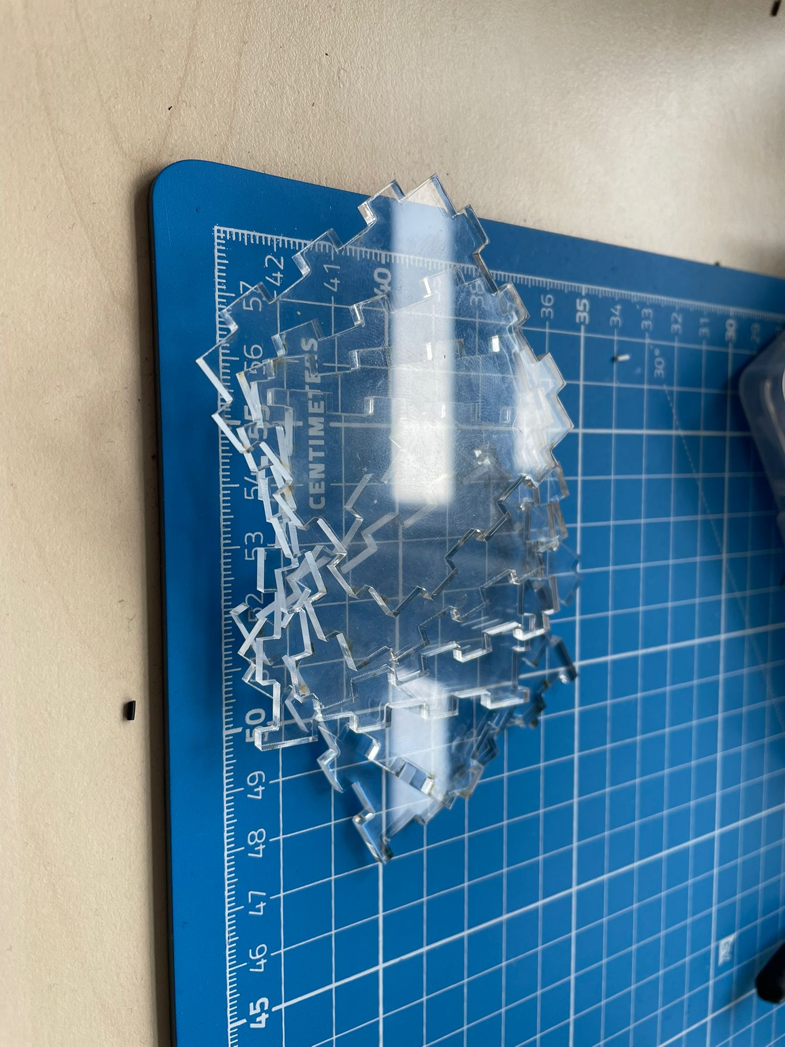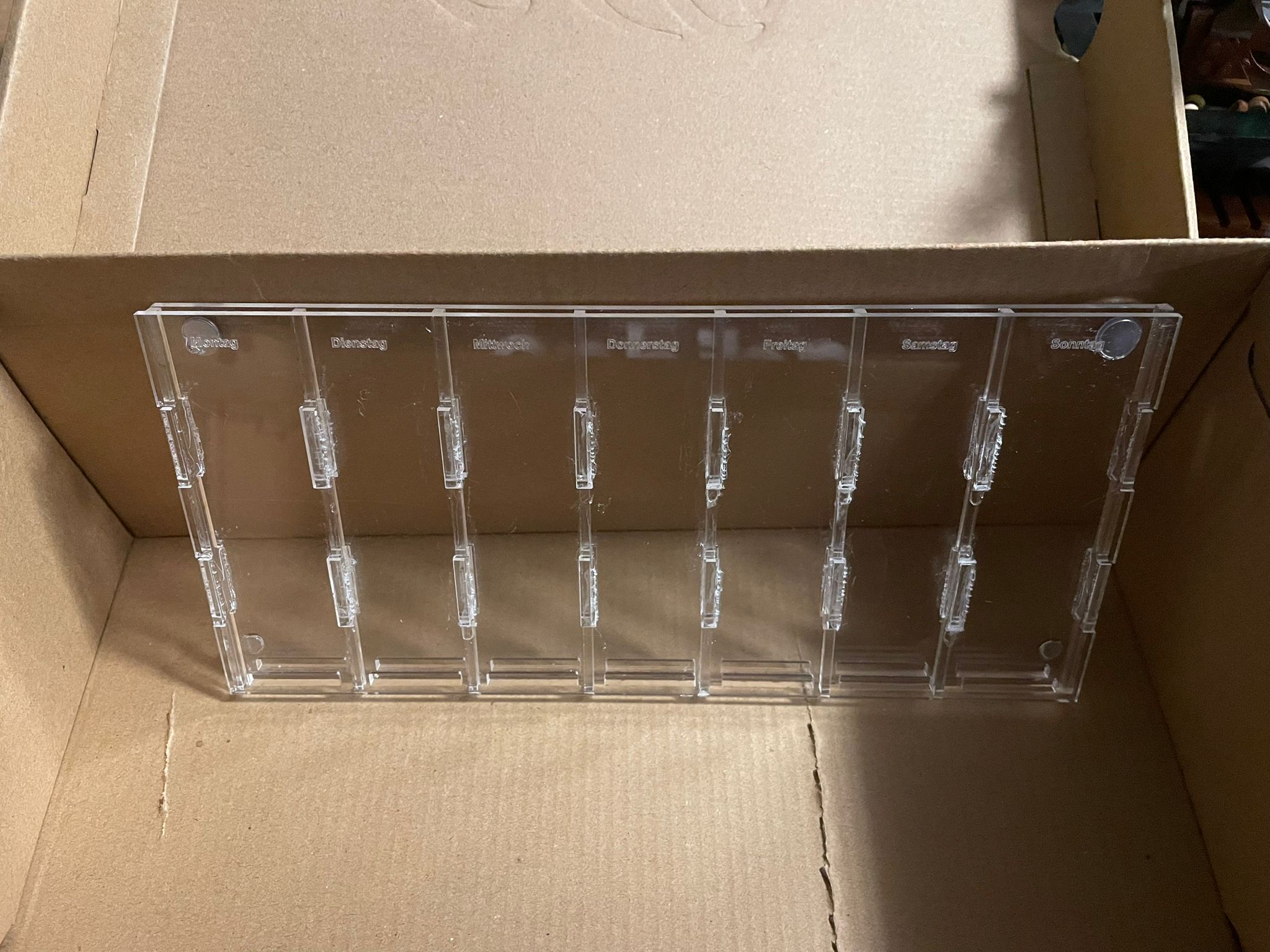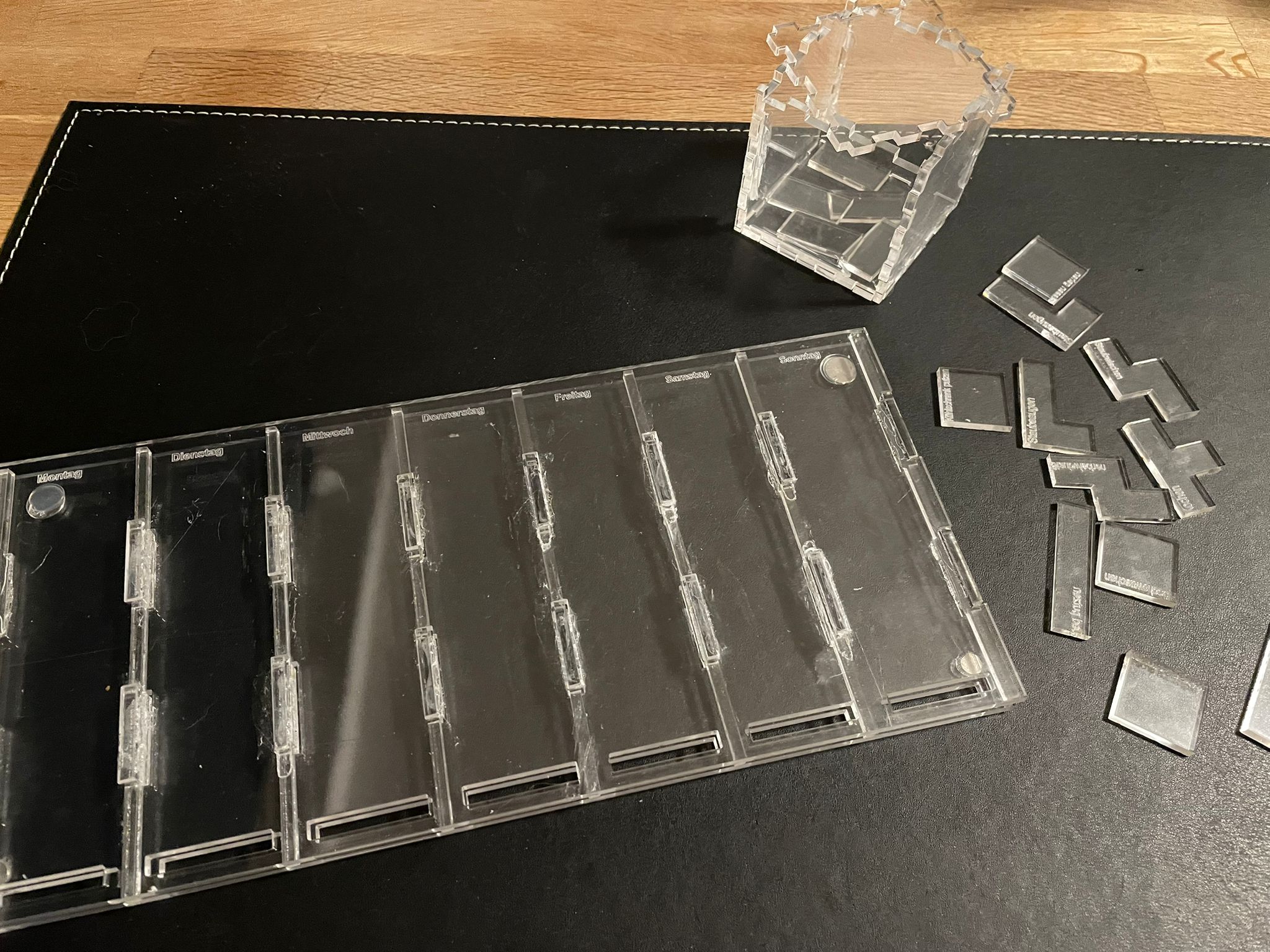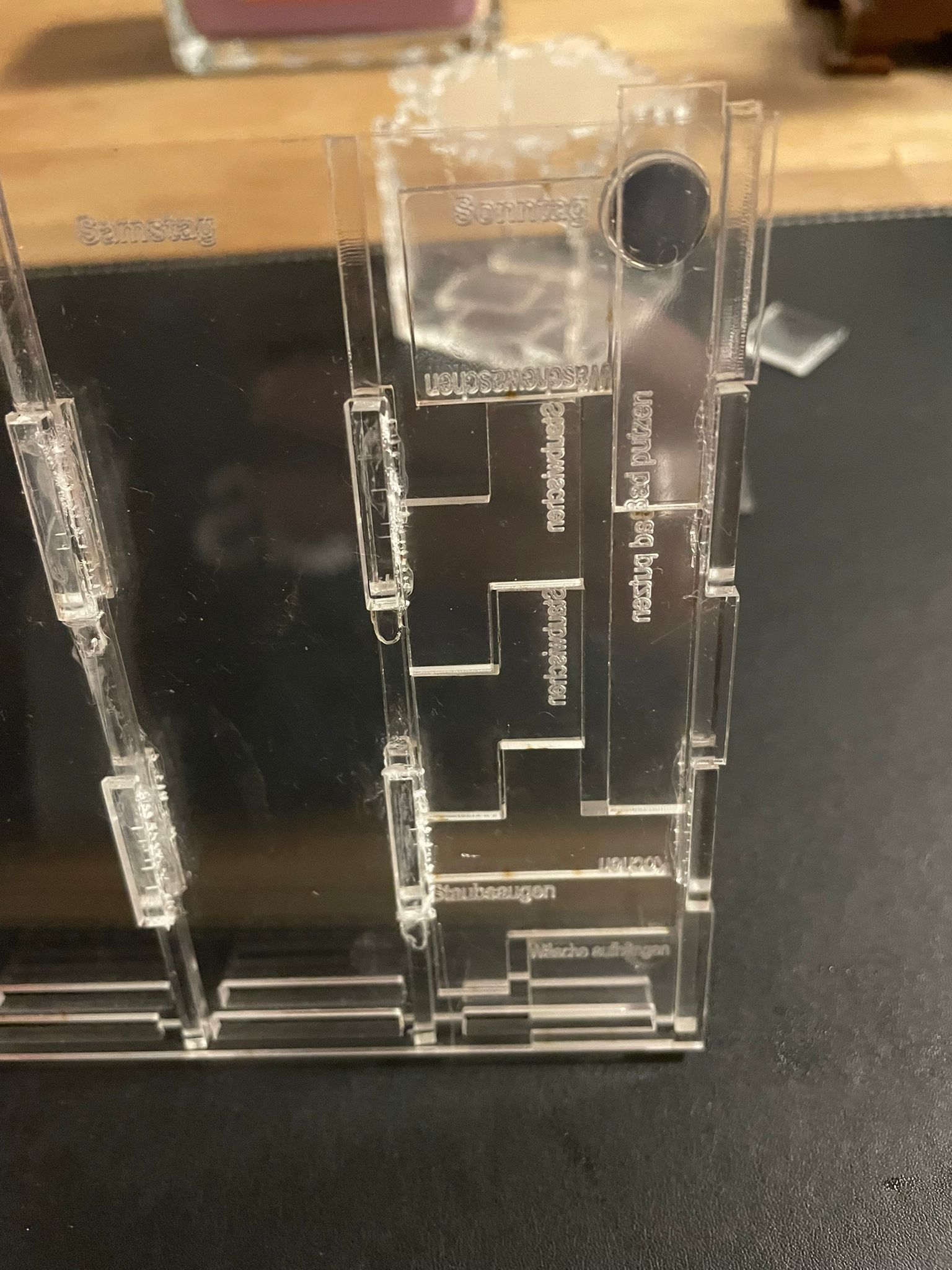 Wir haben die Idee gehabt, einen magnetischen Haushalt Wochenplaner aus Acryl zu entwickeln. Der Planer besteht aus zwei Acrylplatten (12x25cm), die wir in Inkscape entworfenen und im Lab mit dem Lasercutter ausgeschnitten und graviert haben. Diese Platten wurden mit Abstandshaltern so verklebt, dass zwischen Vorder- und Rückplatte schmale Schlitze und Fächer entstehen. Als Aufgabenelemente haben wir kleine, Tetris-Acrylplättchen gefertigt, die jeweils mit der jeweiligen Aufgabe graviert sind und oben in die Führungen eingesteckt werden können. Für jeden Wochentag gibt es unten einen schlitzförmigen Durchzug, in den ein Stift gesteckt wird. Damit lassen sich die Plättchen einfach herausnehmen. Auf der Rückseite sind Magnete angeklebt, sodass der Planer am Kühlschrank befestigt werden kann.