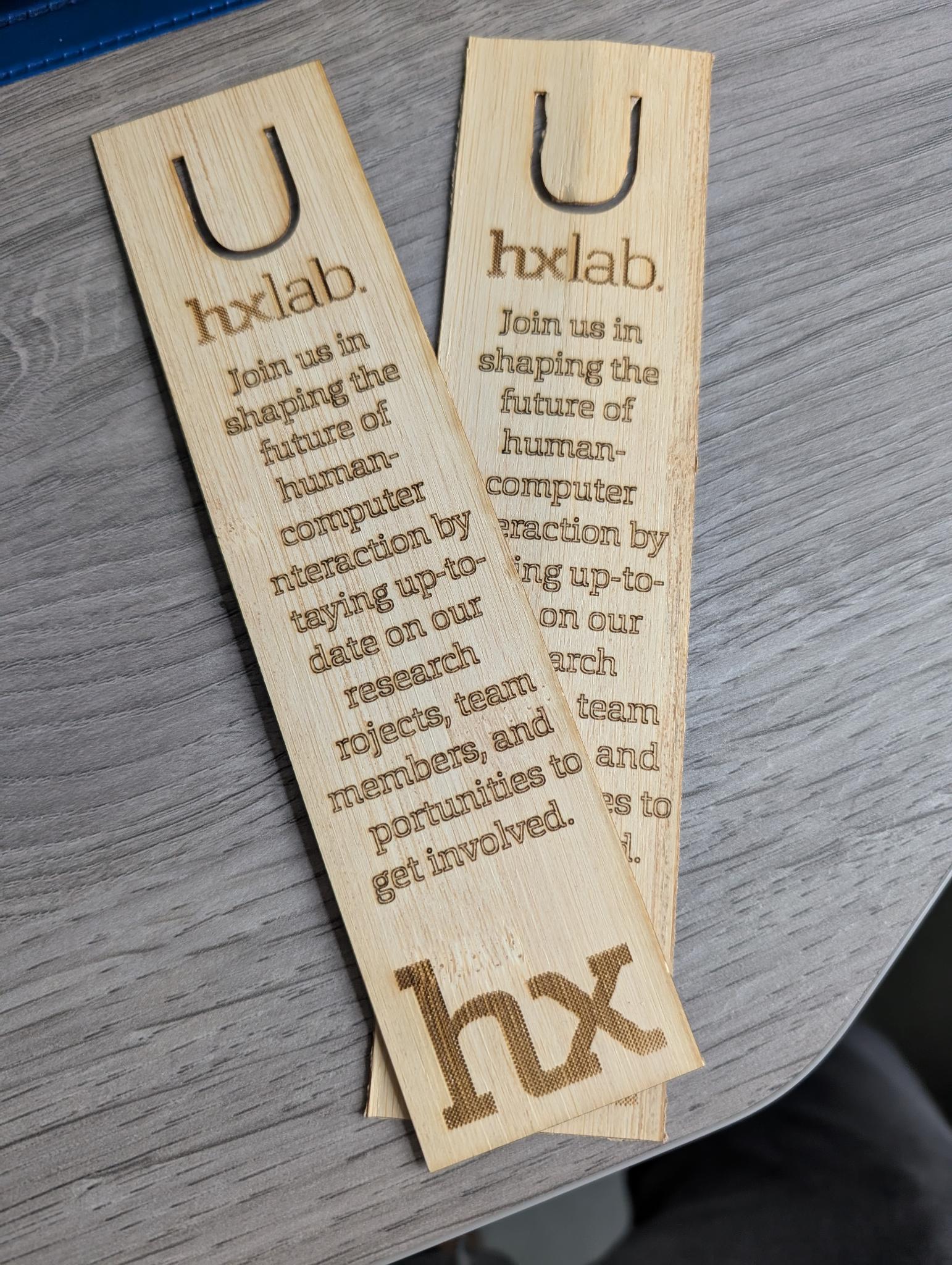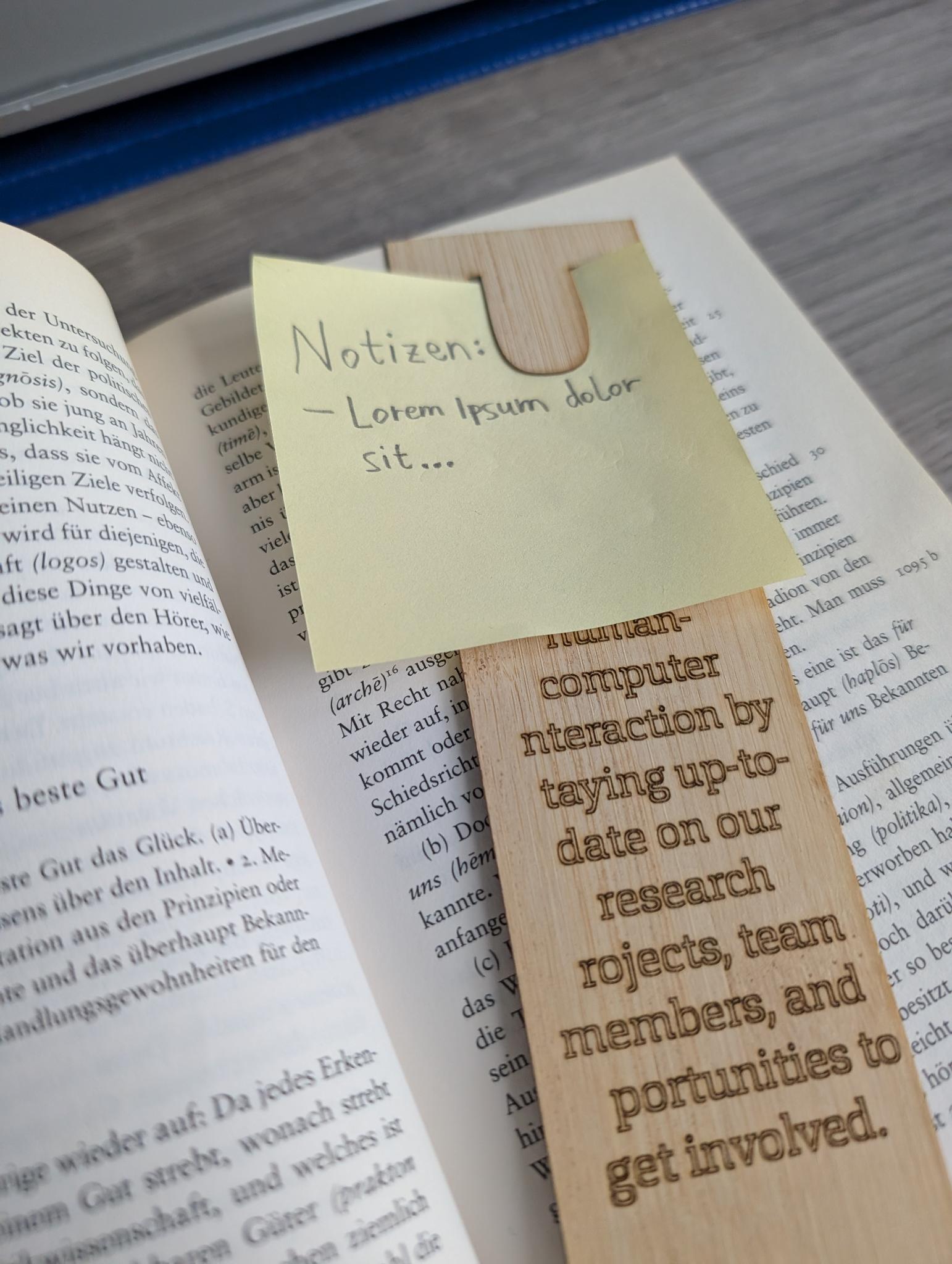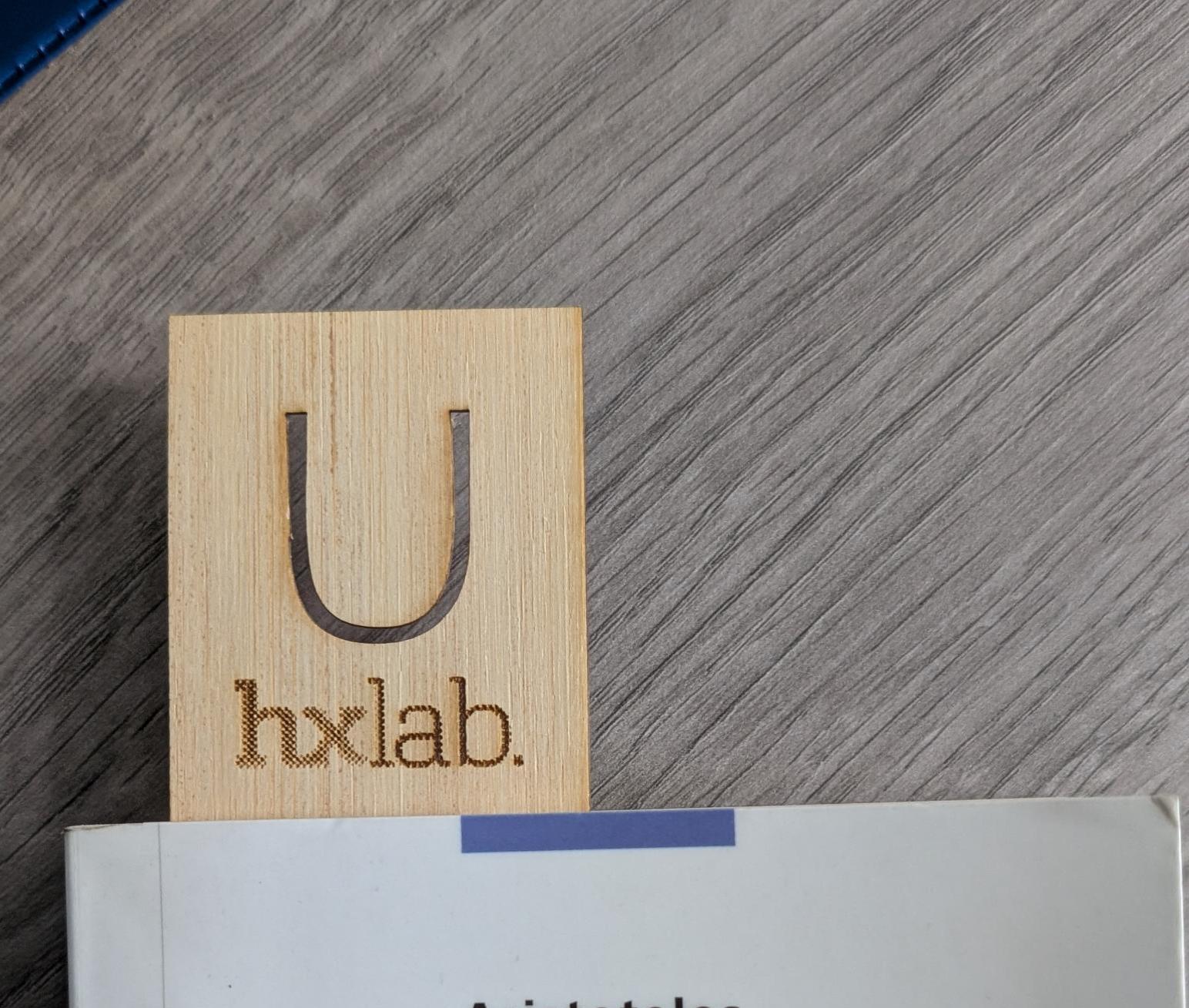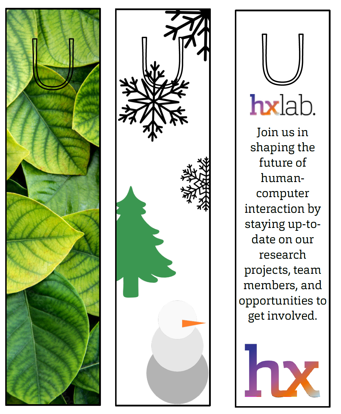 1. Ein Bildhintergrund aus Blättern, 2. ein Motiv aus Weihnachtsfiguren und 3. eine Art Werbung für das hxlab. Am Ende wurde aus Zeitgründen nur das dritte Design gecuttet, da dieses im Vergleich weniger Bild-Schnitte aus Pixeln benötigt. Eine Besonderheit des Lesezeichens ist der “U”-Förmige Ausschnitt an der oberen Seite, mit dem man z. B. Notizen anheften kann.
