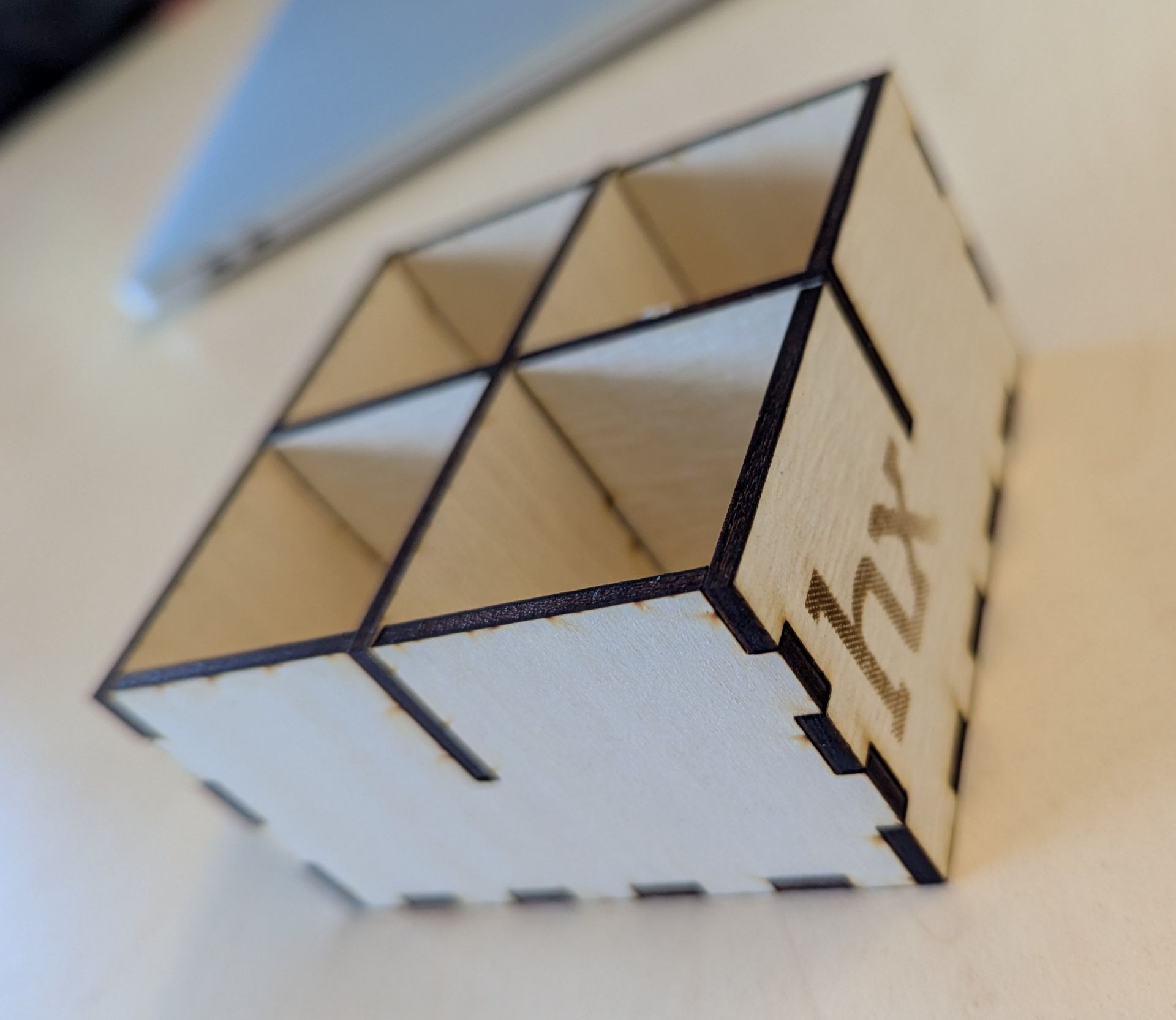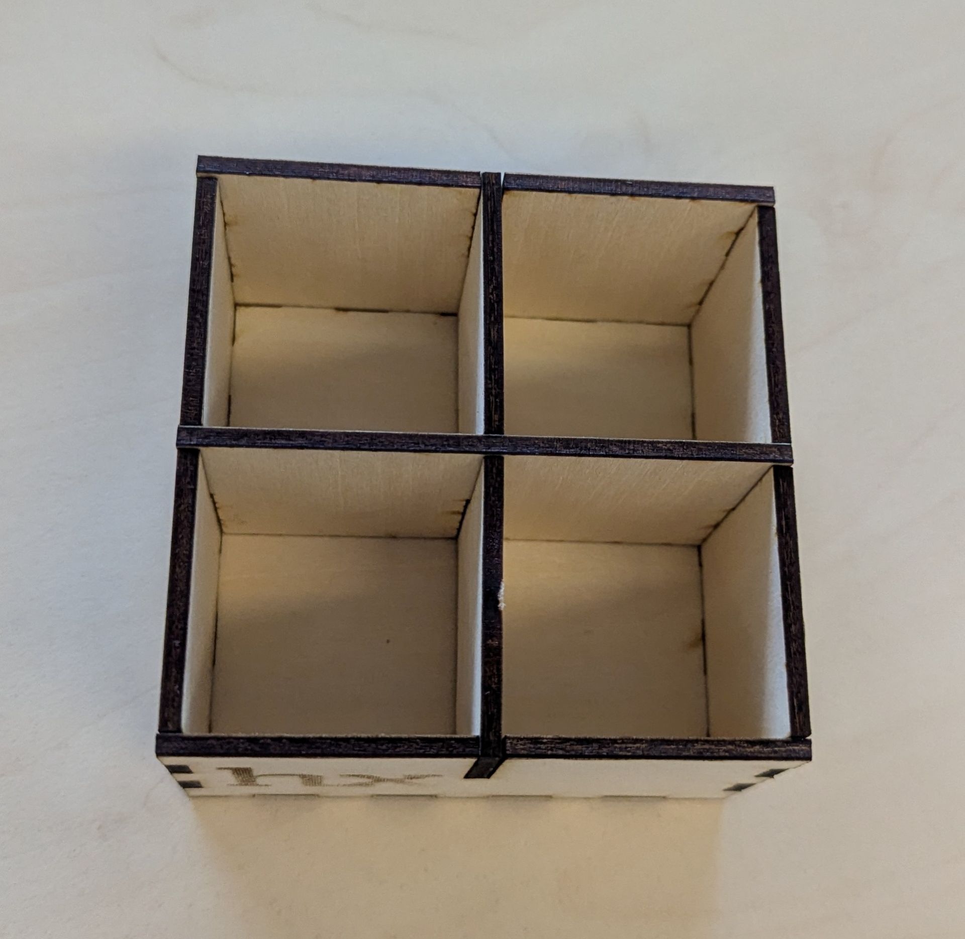 Wir haben uns für die dritte Challenge für eine einfache Box mit vier Kammern entschieden. Diese haben wir mithilfe des Lasercutters und einer Vorlage erstellt. Um die Box visuell etwas aufzuwerten, haben wir das “hx”-Logo auf eine Seite eingravieren lassen. Die Box misst 90x90x50mm. Mithilfe der Vorlage konnte zügig ein Werkstück während der Laborzeit erstellt werden.
