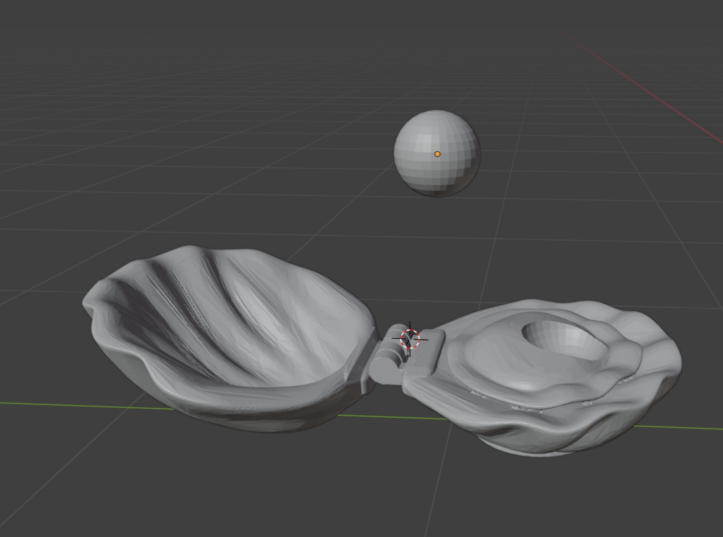 Für das Modell haben wir uns eine Vorlage aus dem Internet heruntergeladen und diese in Blender angepasst. So mussten wir zum Beispiel noch das Scharnier hinzufügen, damit sich unsere Muschel auch öffnen lässt.