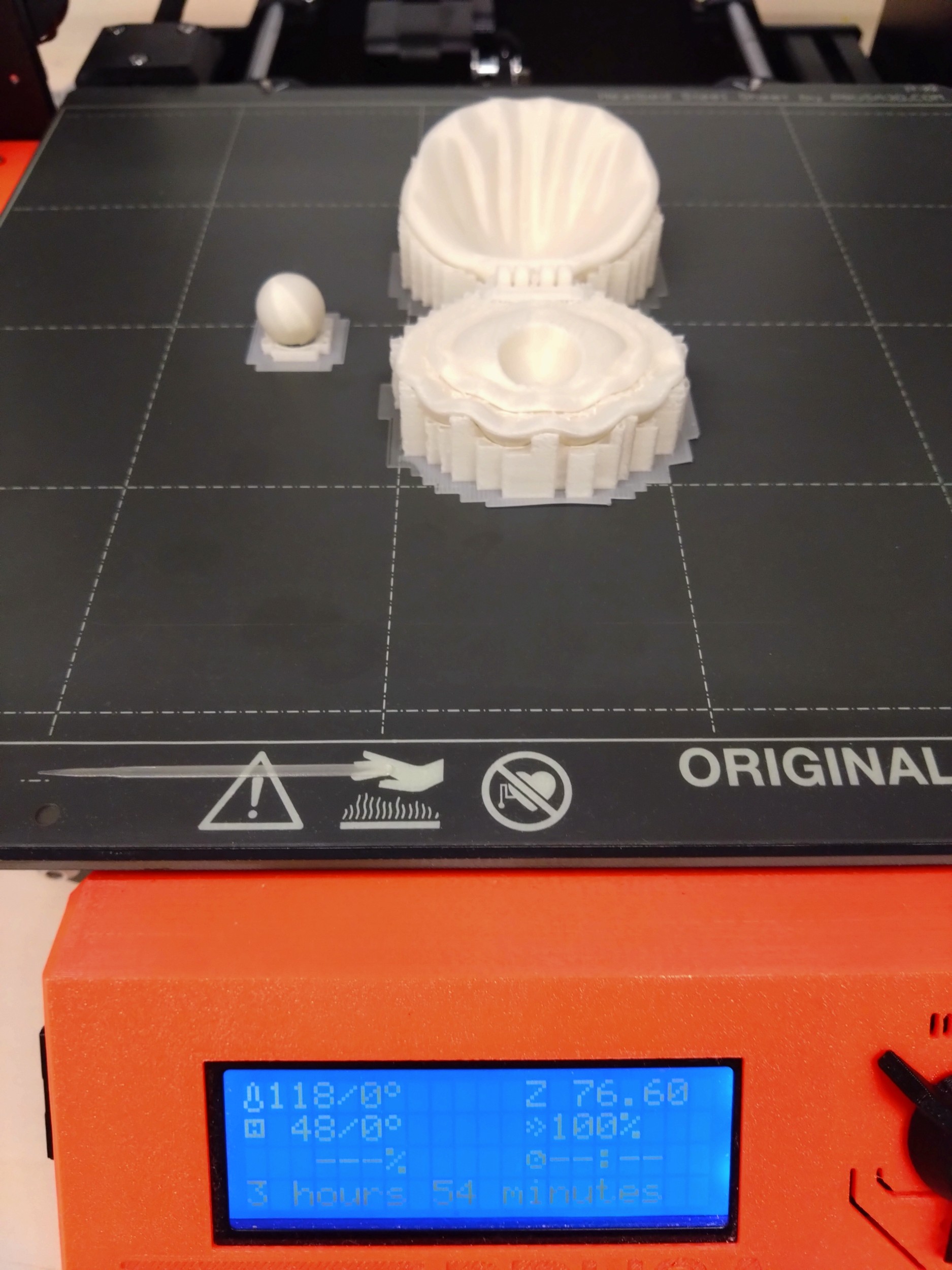 Mit dem Prusa Slicer haben wir das fertige Modell für den Druck vorbereitet und anschließend mit dem Prusa i3 gedruckt. Bevor wir die komplette Muschel gedruckt haben, haben wir das Scharnier zum Testen gedruckt. Im ersten Durchgang gab es ein Problem, weil die in Blender gejointen Meshes vom Slicer nicht richtig erkannt wurden (was leider durch die Supports nicht aufgefallen ist), wodurch ein Teil des Scharniers gefehlt hat. Nach einem Remesh in Blender konnte die Muschel dann anschließend in einem Teil gedruckt werden, was knapp 4 Stunden gedauert hat.