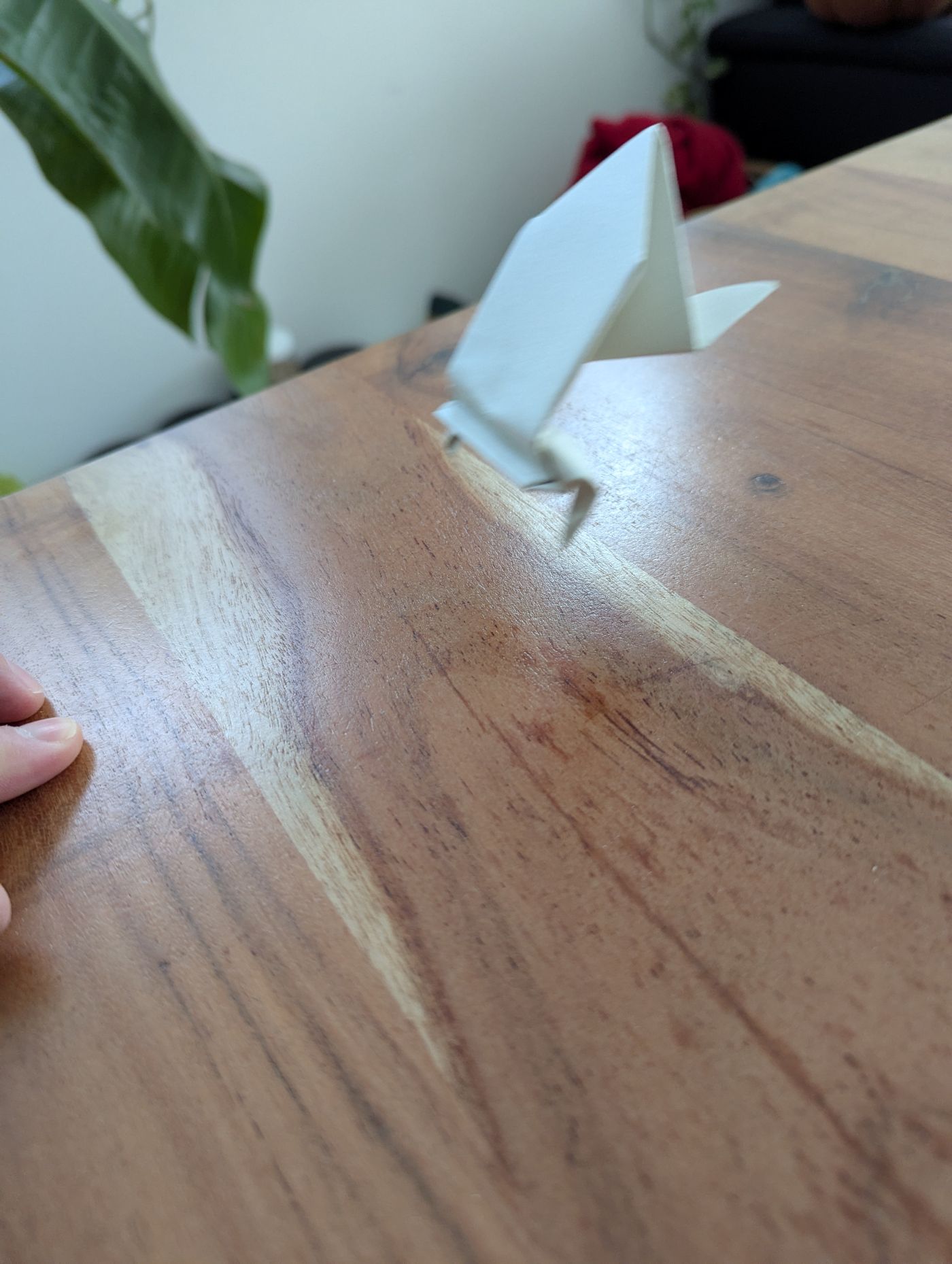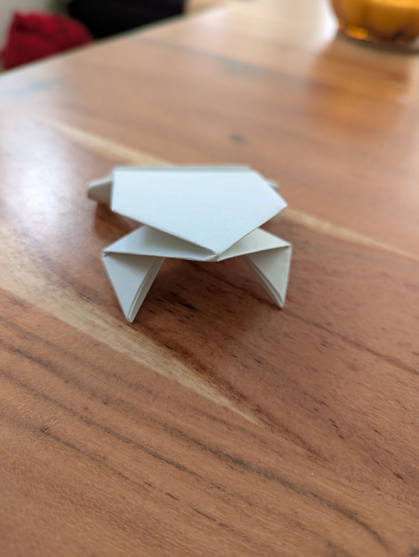 Für die dieswöchige Abgabe sind wir zurück zum ersten Werkstoff Papier zurückgegangen und haben einen Frosch mithilfe der Origami-Kunst gebastelt. Der Frosch besteht aus einem quadratischem Stück Papier, welches 21cmx21cm misst. Spielerisch könnte der Frosch ganz oben für kleine Kinder stehen. Durch die niedrigen Anforderungen an Material und Komplexität lässt sich der Frosch recht schnell nachbasteln und war perfekt für die Abgabe. Wir hätten nicht gedacht, dass der Frosch so gut springen kann.