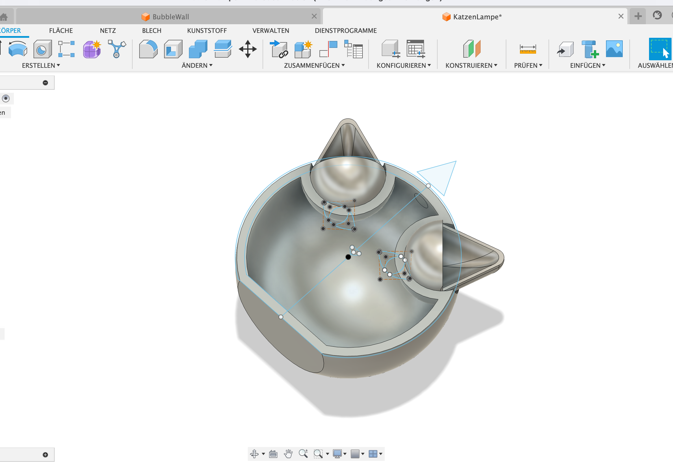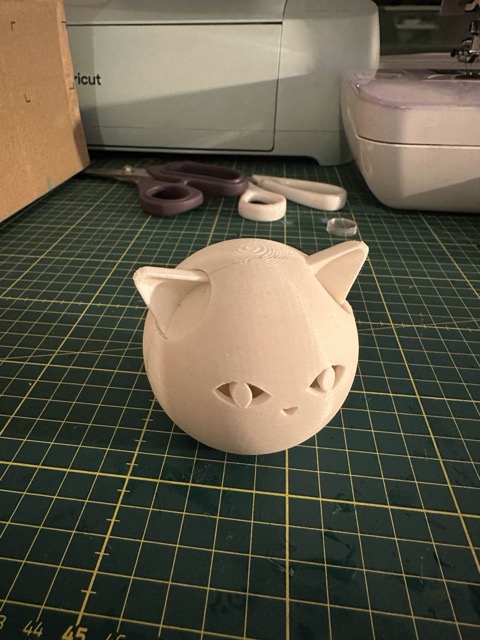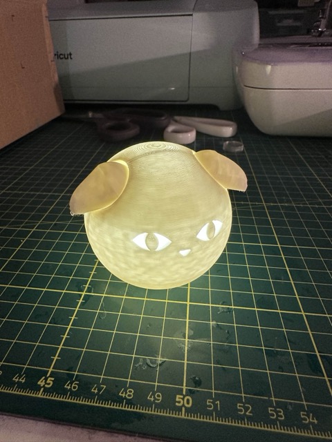 Wir haben die Katzenlampe zunächst in Fusion360 erstellt und anschließend so gedruckt, dass der Körper in zwei Teile geteilt war. Anschließend haben wir die Öhrchen eingesetzt, den Körper geschlossen und verklebt.