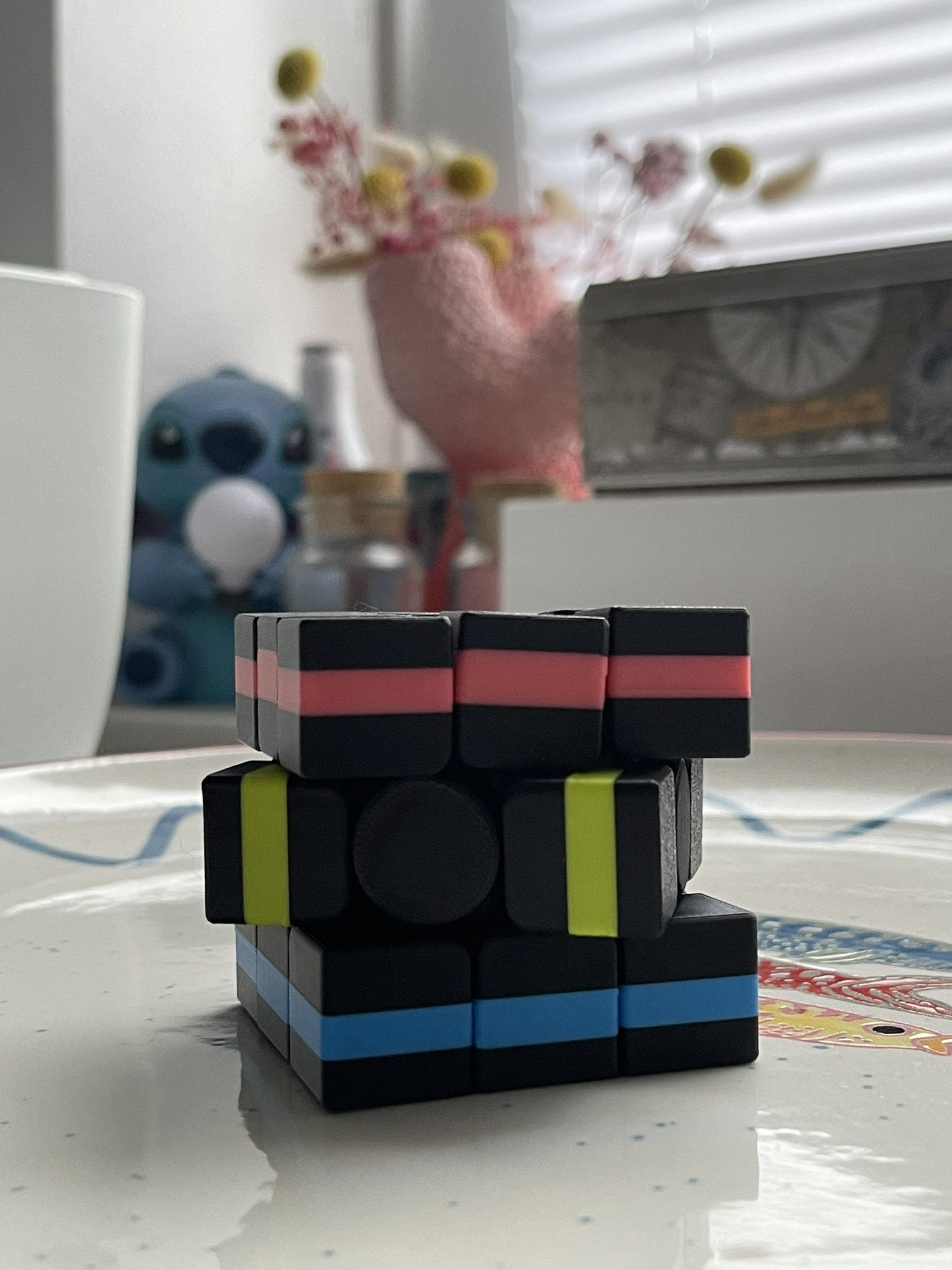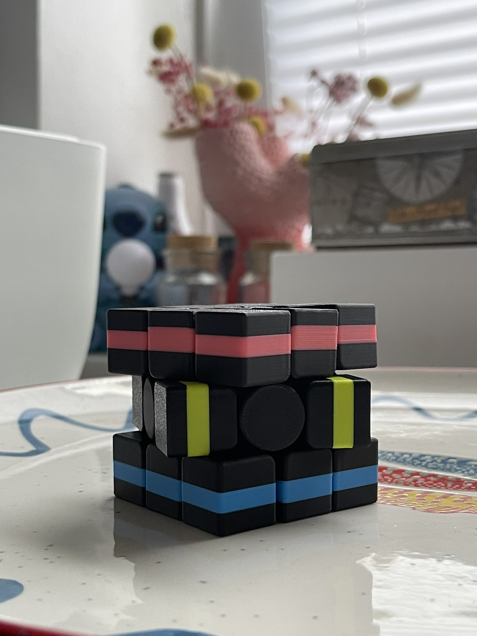 In dieser siebten Weekly-Challenge-Woche haben wir einen Cubic-Würfel gedruckt und dabei verschiedene Arbeitsschritte selbst übernommen. Jede Ebene besitzt horizontale Farbstreifen in Rot und Blau sowie einen vertikalen Farbstreifen in Gelb, was die Orientierung beim Drehen deutlich erschwert. Durch unterschiedliche Drehbewegungen entstehen komplexe Muster und neue Farbkombinationen.