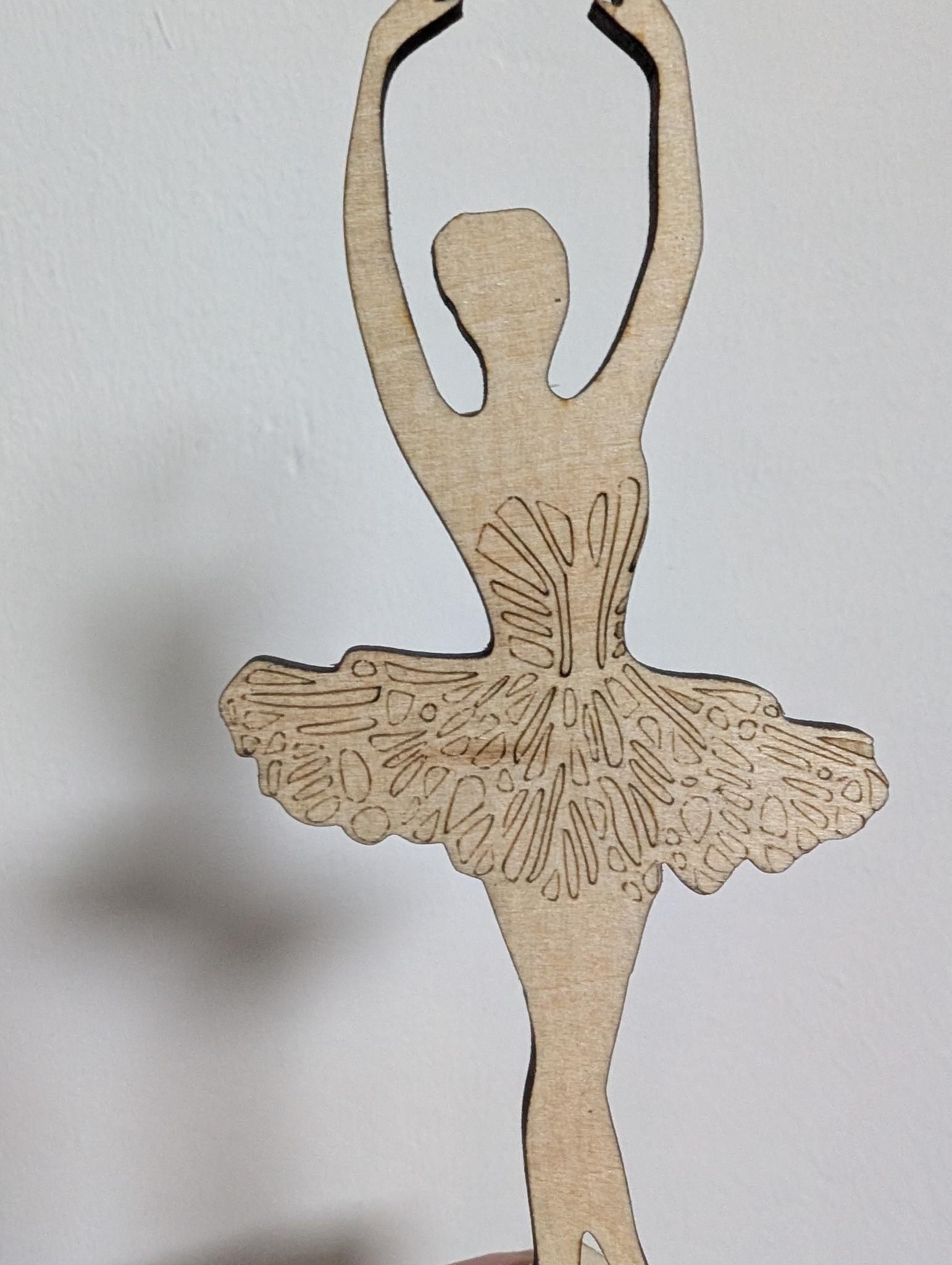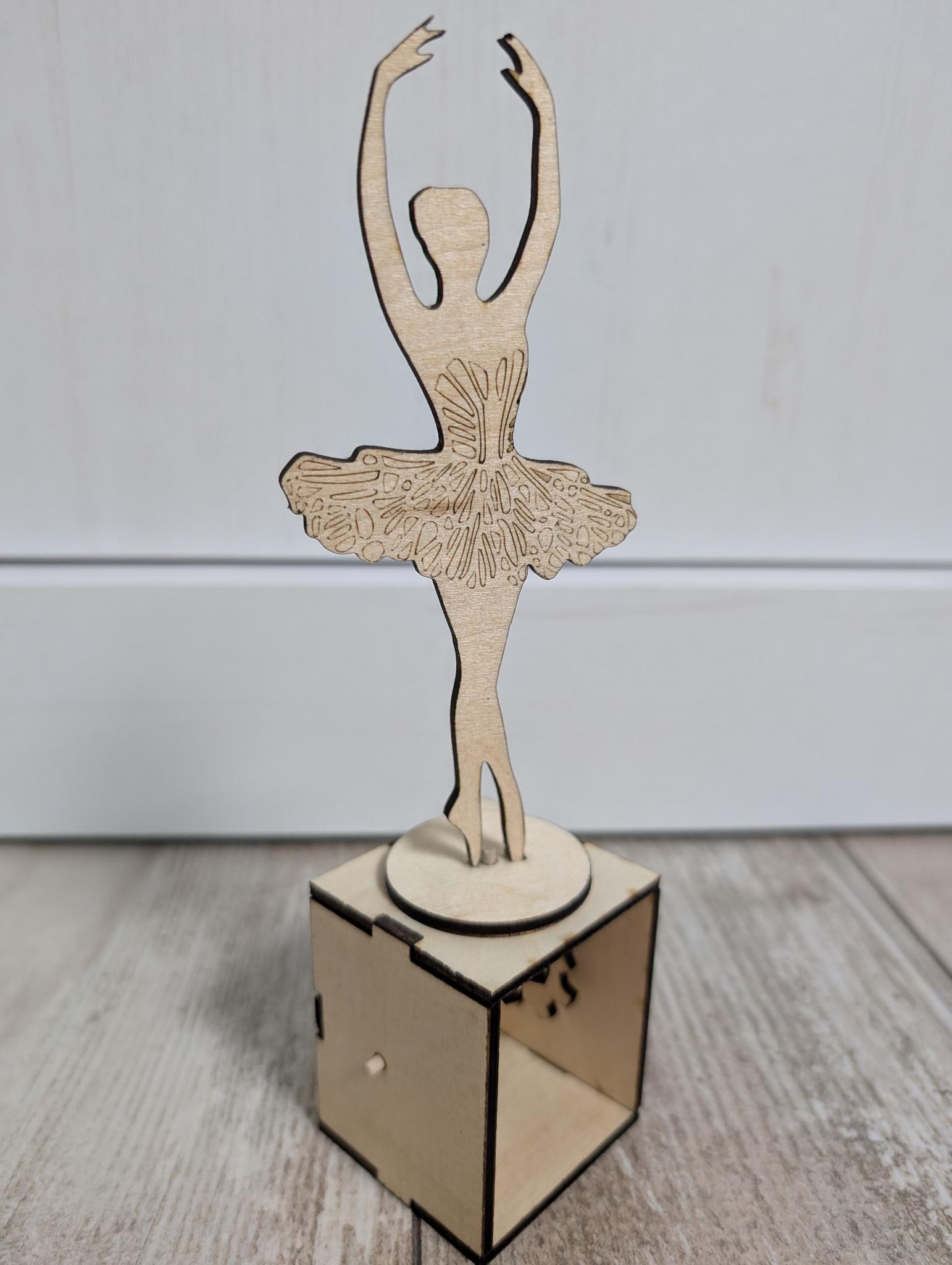 Diese Woche haben wir eine kleine Ballerina gebaut, die sich wie bei einer Spieluhr drehen lässt. Den Großteil der Teile haben wir dabei mit dem Lasercutter ausgeschnitten. Für die Achsen haben wir zwei Schaschlikspieße verwendet.