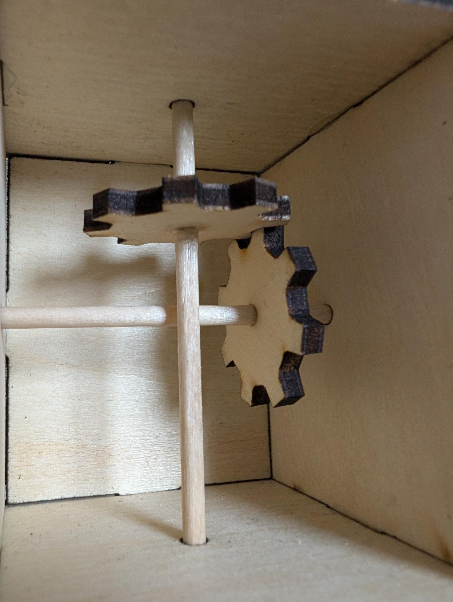 Die Konstruktion besteht aus einer kleinen Box mit Aussparungen, über die sich die Wände ineinander stecken lassen. Außerdem befinden sich in den Wänden Löcher für die Achsen, die zwei kleine Zahnräder aufnehmen. Oben befindet sich noch eine runde, drehbare Plattform, in die die Ballerina gesteckt wird. Alle Teile haben wir vorher in Inkscape entworfen und dann aus 3mm Lindenholz mit dem Lasercutter ausgeschnitten bzw. graviert.