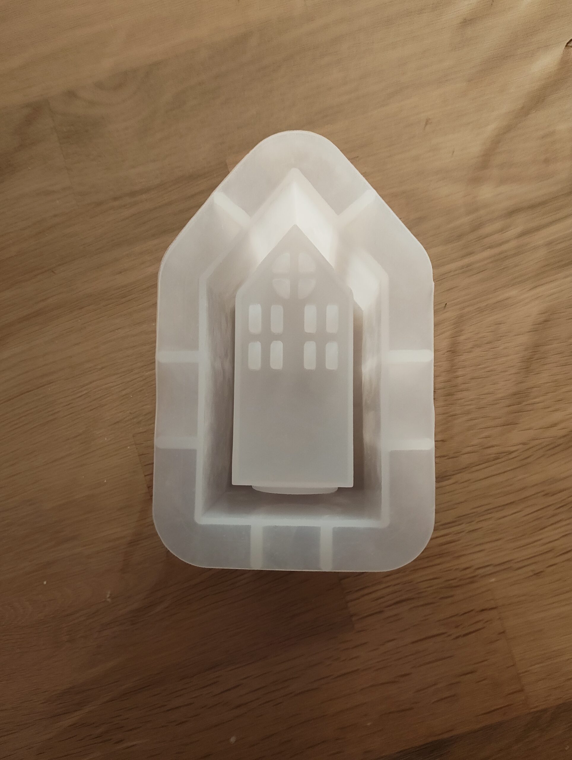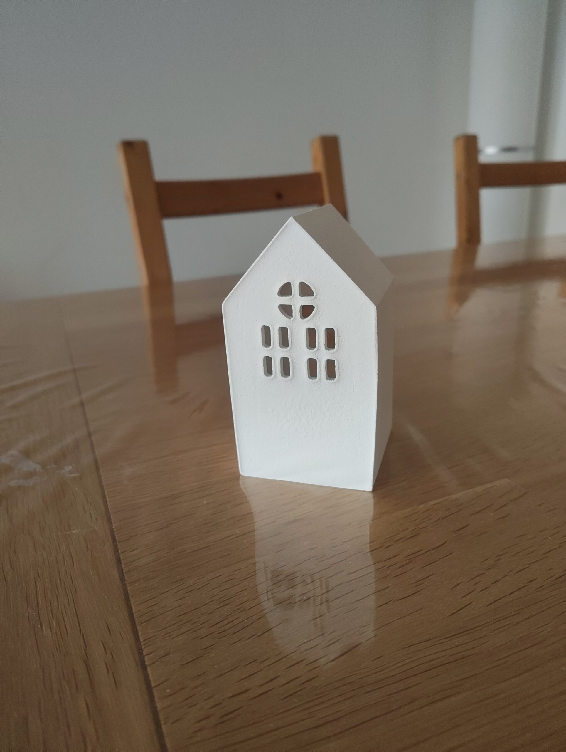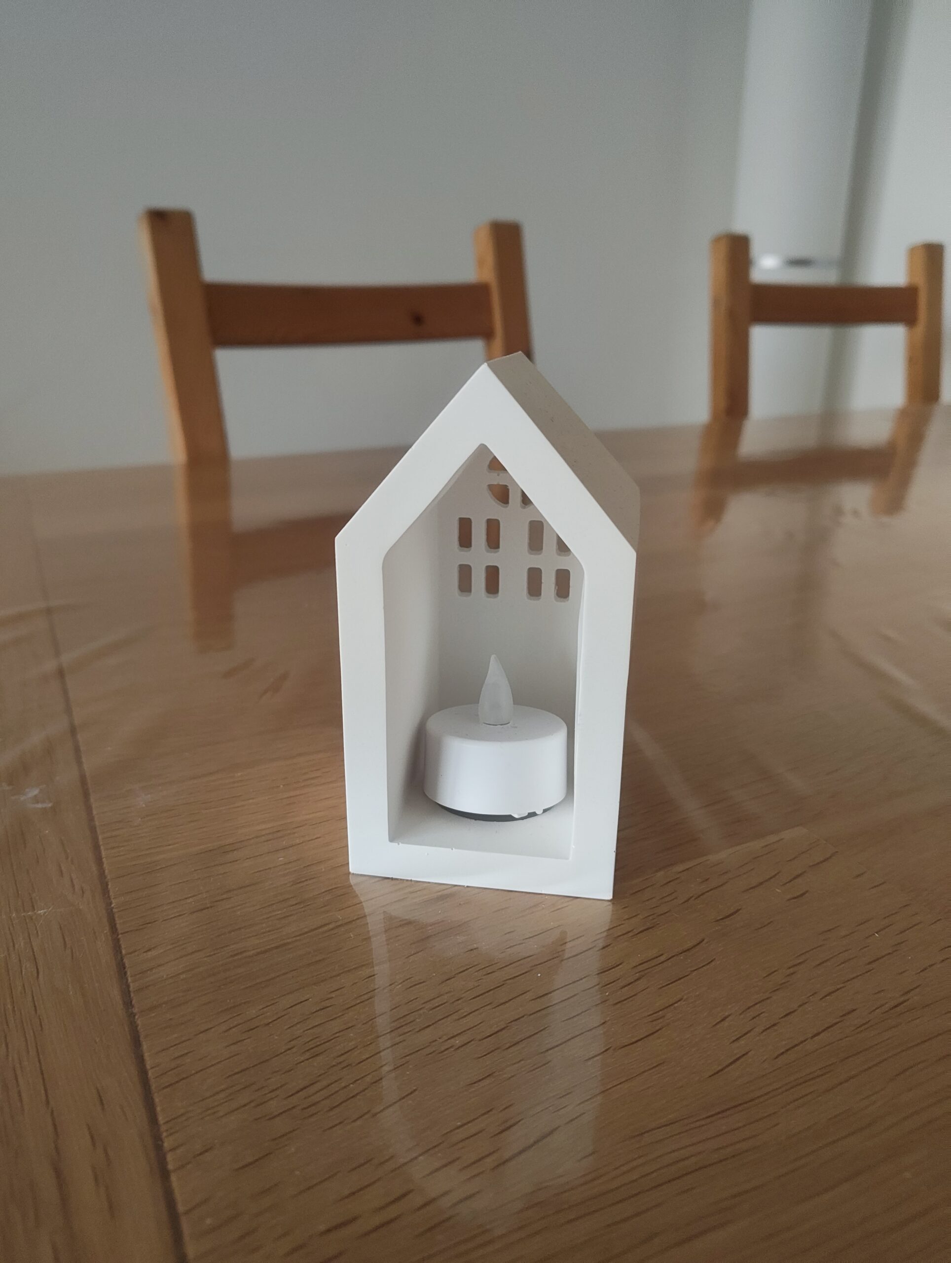 Für diese wöchentliche Aufgabe habe ich zusammen mit meiner Freundin ein Haus aus Gips gegossen. Auf der Rückseite besitzt das Haus eine Aussparung, in die man eine Kerze oder eine LED-Kerze stellen kann. Ebenfalls dort habe ich hinter den Fenstern ein Stück pinkfarbenes, transparentes Papier angebracht, das dem austretenden Licht einen wärmeren Ton verleiht und dem gesamten Häuschen im Dunkeln eine gemütliche, stimmungsvolle Atmosphäre schenkt.