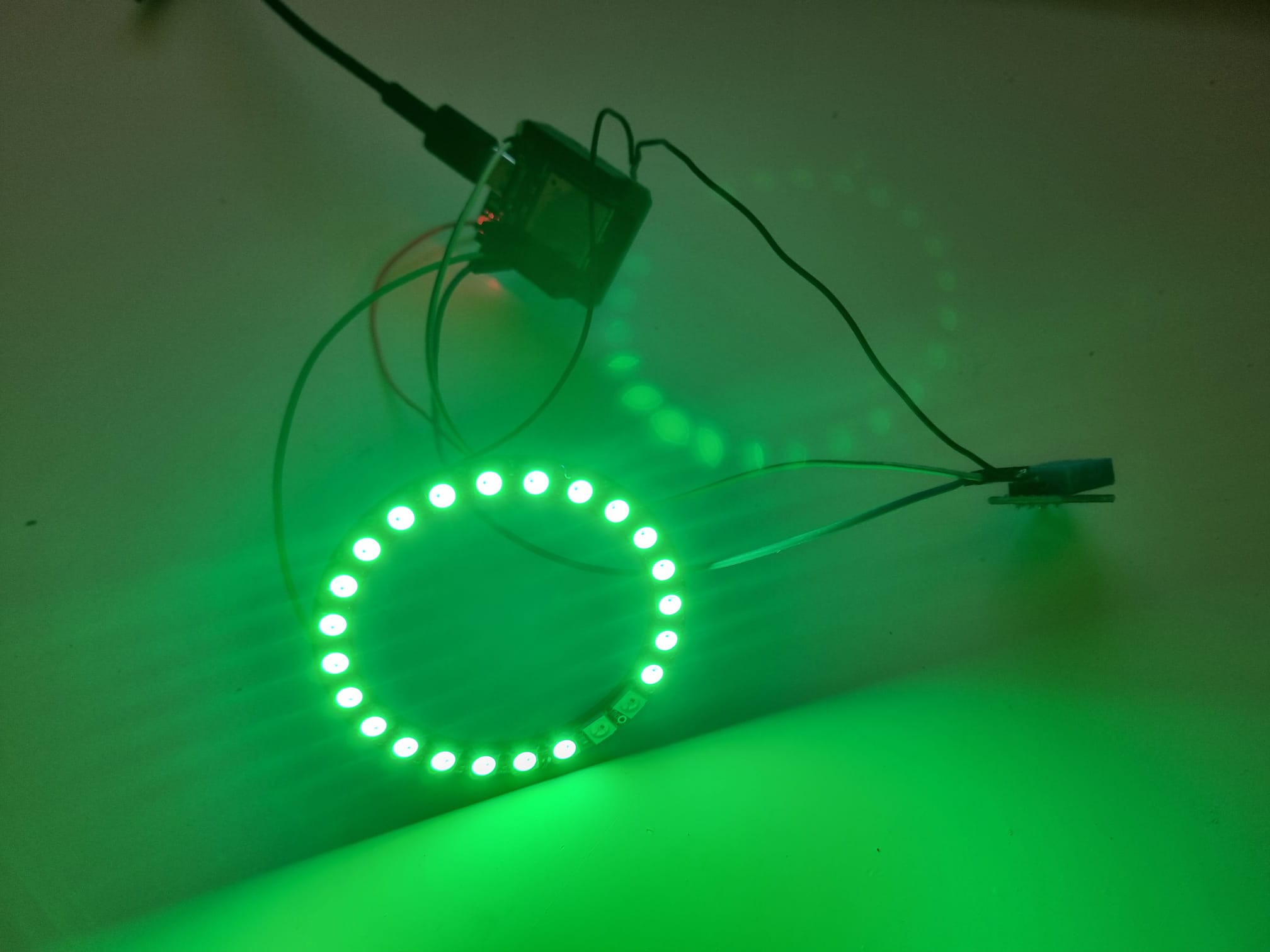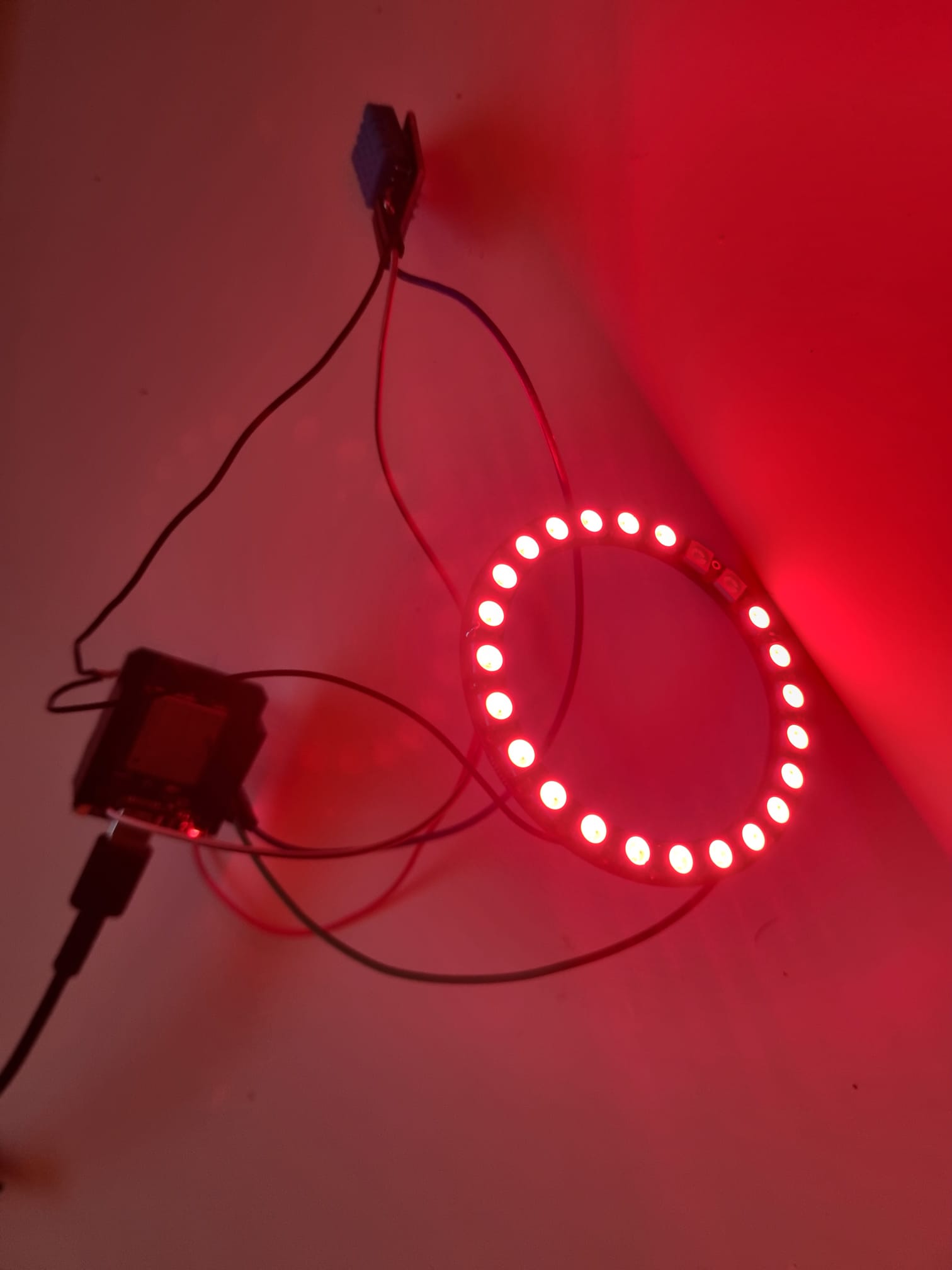 Praktisch ist der Neopixel Ring an gpio16 angelötet, der Sensor an gpio 4. Power bekommt der Sensor über die 3.3V Schnittstelle, der Neopixel Ring über die 5V vcc Schnittstelle. Beide Bauteile sind am Ground angeschlossen.