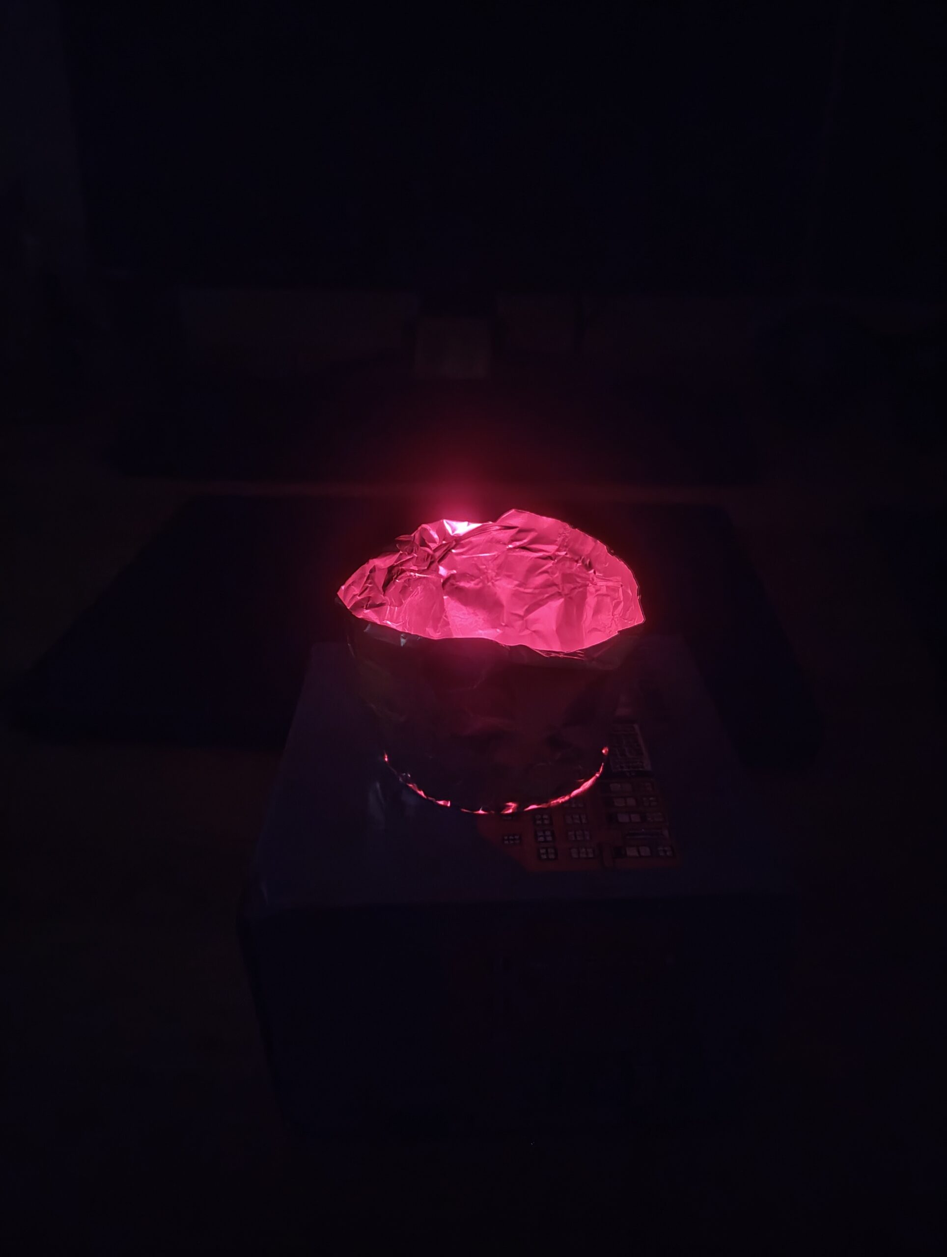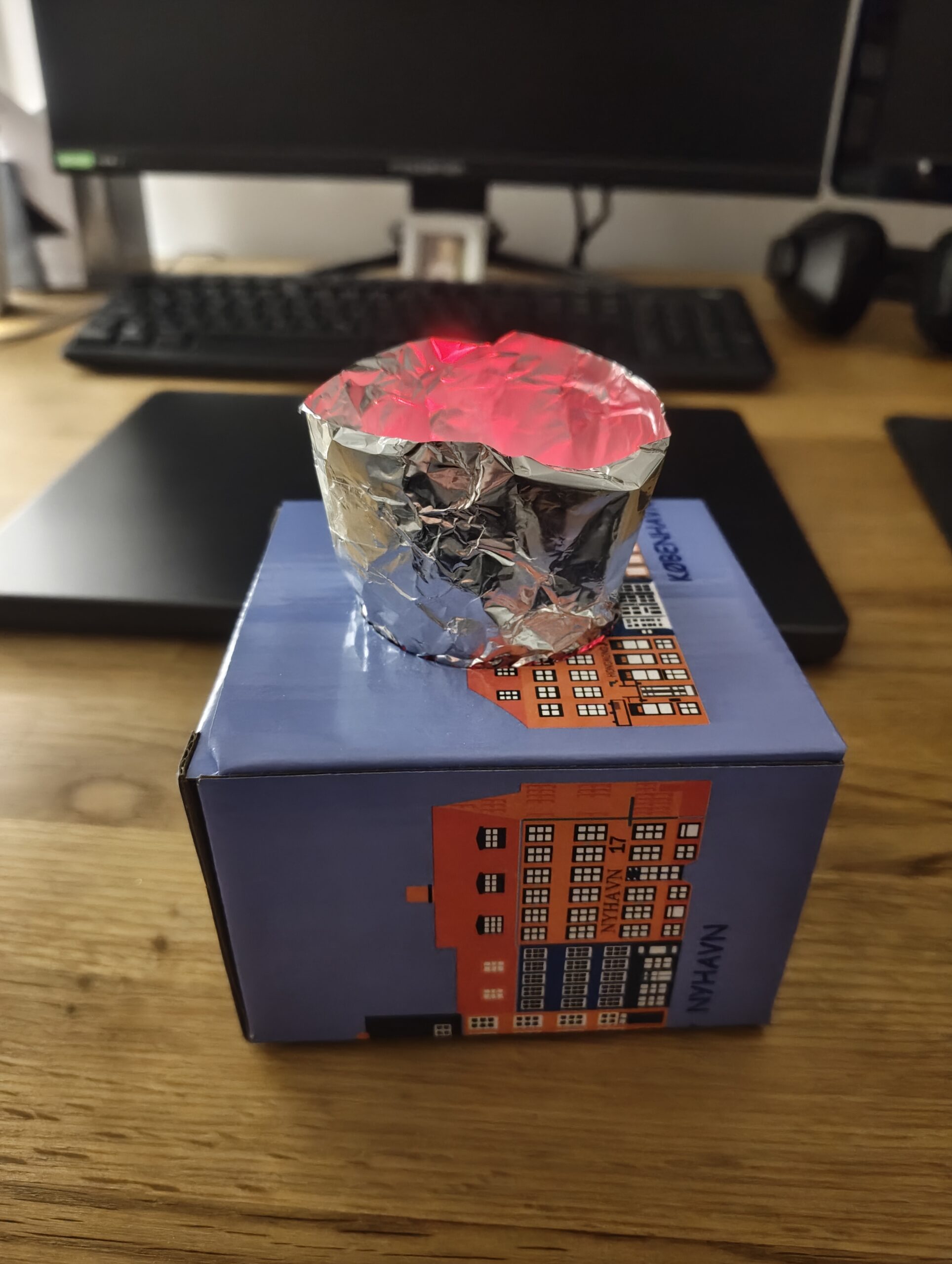 Für diese wöchentliche Aufgabe habe ich den weit verbreiteten “Clapper” nachgebaut. Er fungiert so, dass ein Audio-Input, sprich ein Mikrofon auf Input-Signale hört, diese dann an ein Esp-Mikrokontroller weiterleitet und dieser dann den Stromfluss zu einer oder mehreren LEDs durchleitet. Um das ganze schön zu verpacken, habe ich prototyp-mäßig eine kleine Box genommen, auf der Oberseite ein rundes Loch ausgeschnitten und dann provisorisch erst einmal mit Alufolie einen Trichter gebaut. Dieser Trichter hat nun zwei Funktionen. Zum einen sollen die Schallwellen, welche vom Klatschen oder ähnlichem ausgeben, auffangen und zum Mikrofon tragen. Zum anderen dient die Alufolio dazu, das Licht aus dem Inneren zu kegeln und so das Licht nocht etwas heller scheinen zu lassen: