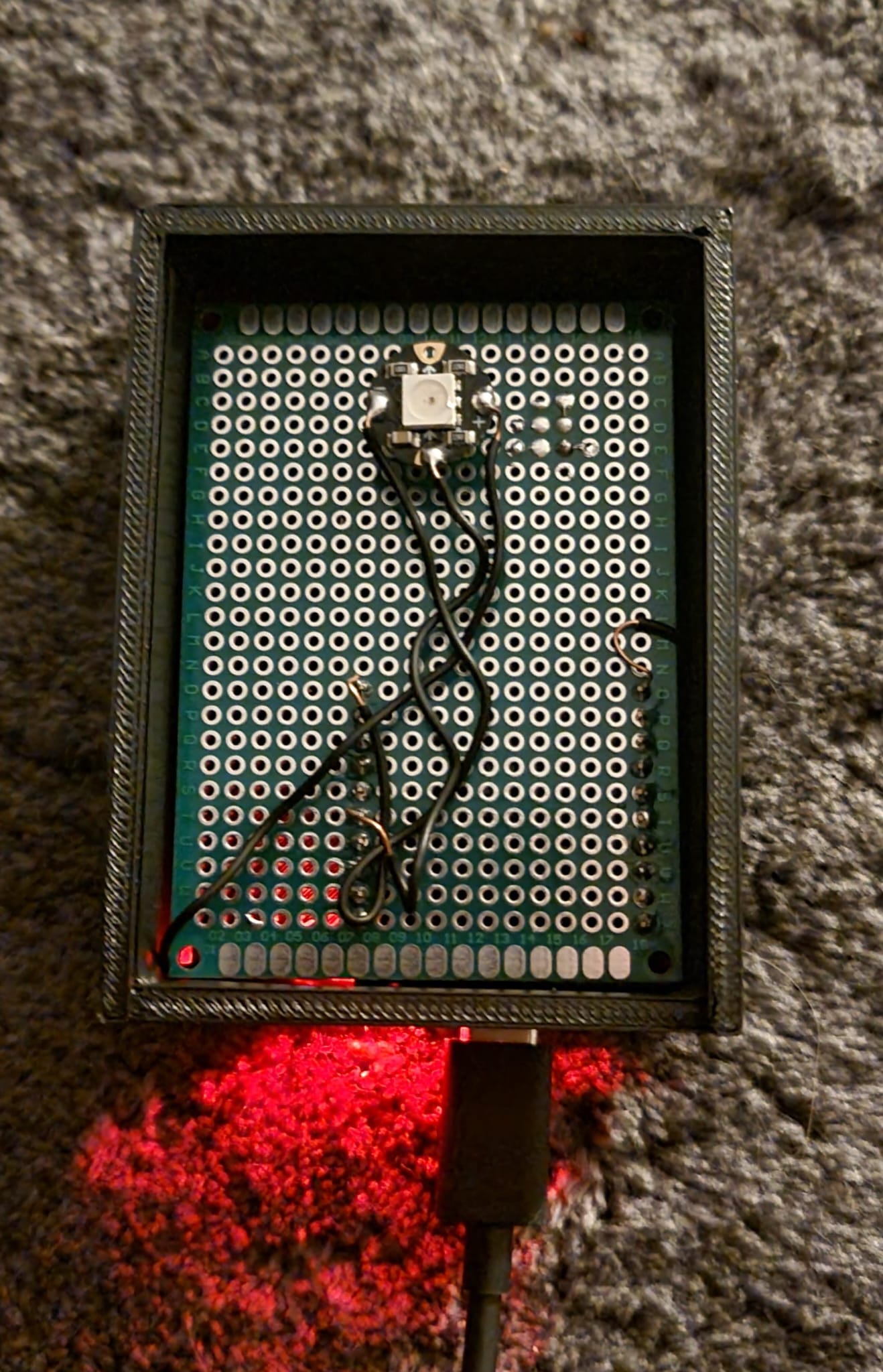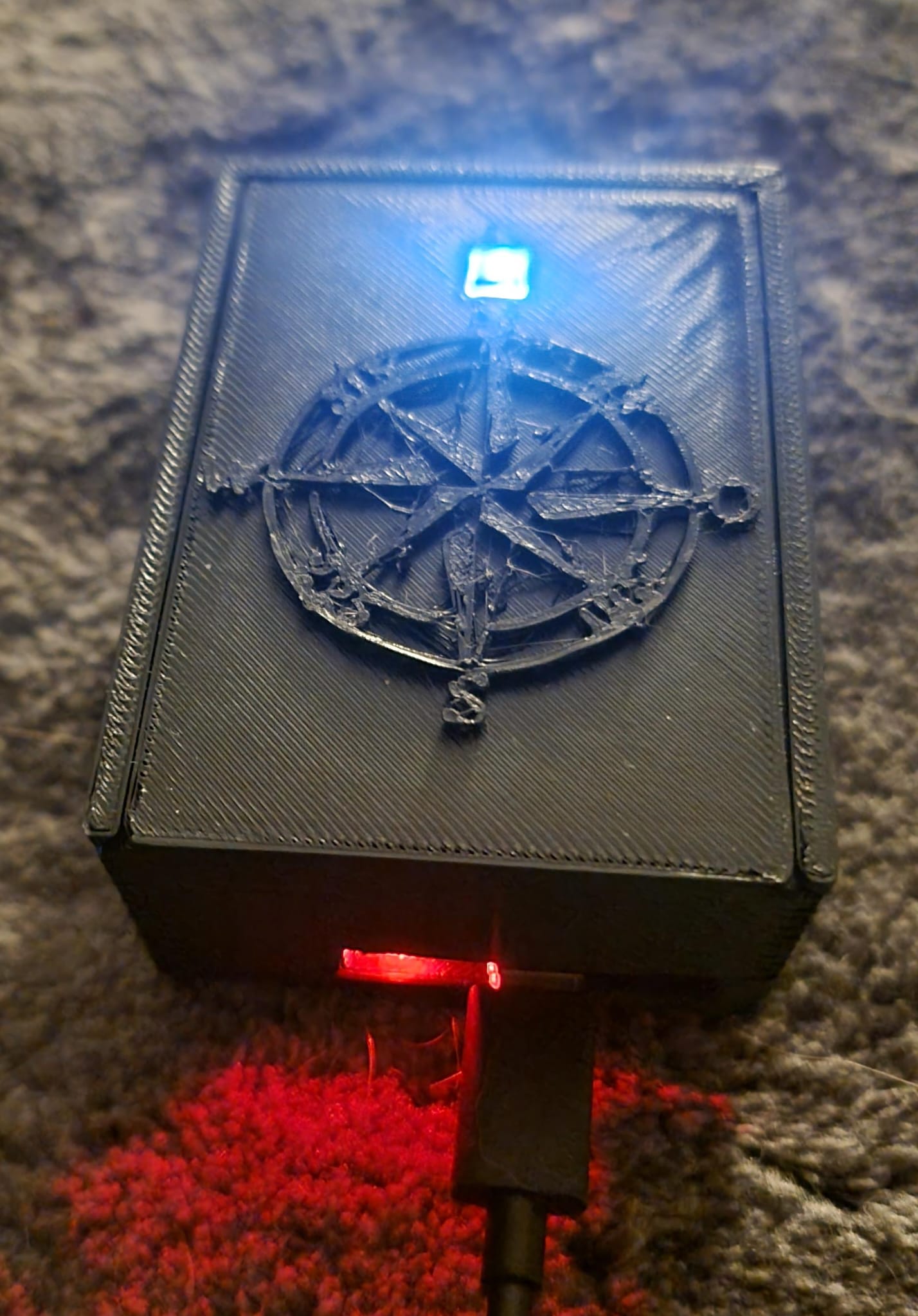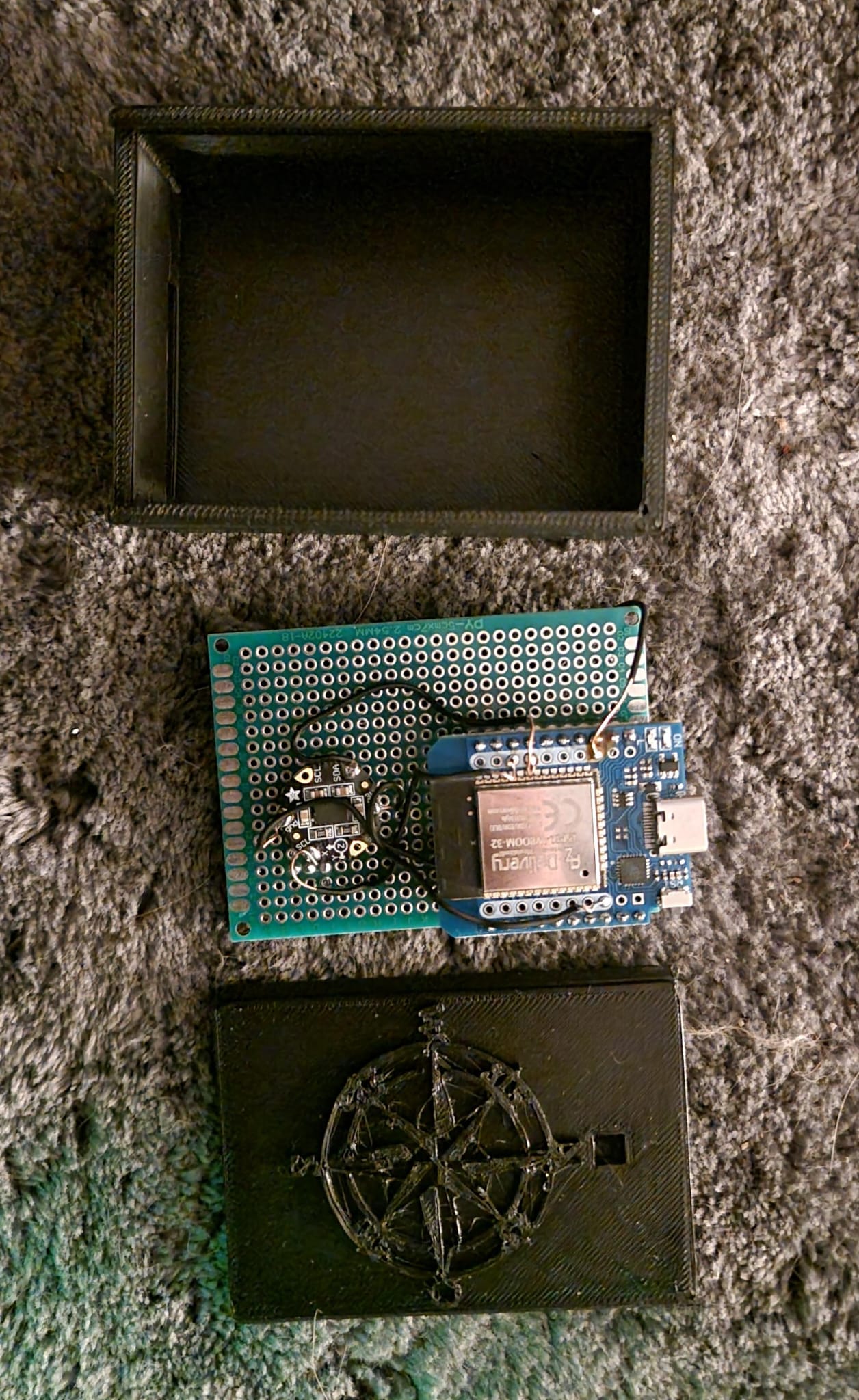 Für die technische Umsetzung nutzten wir einen ESP32-Mikrocontroller in Kombination mit einem LSM303-Magnetometersensor (über I²C angebunden). Die visuelle Rückmeldung erfolgt über eine einzeln adressierbare WS2812-NeoPixel-LED. Alle Bauteile wurden auf einer Lochrasterplatine verlötet, korrekt verschaltet und anschließend in einem eigens konstruierten und 3D-gedruckten Gehäuse mit Kompassdesign untergebracht.