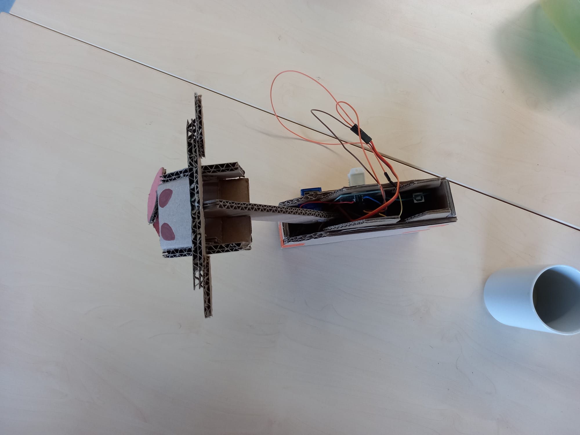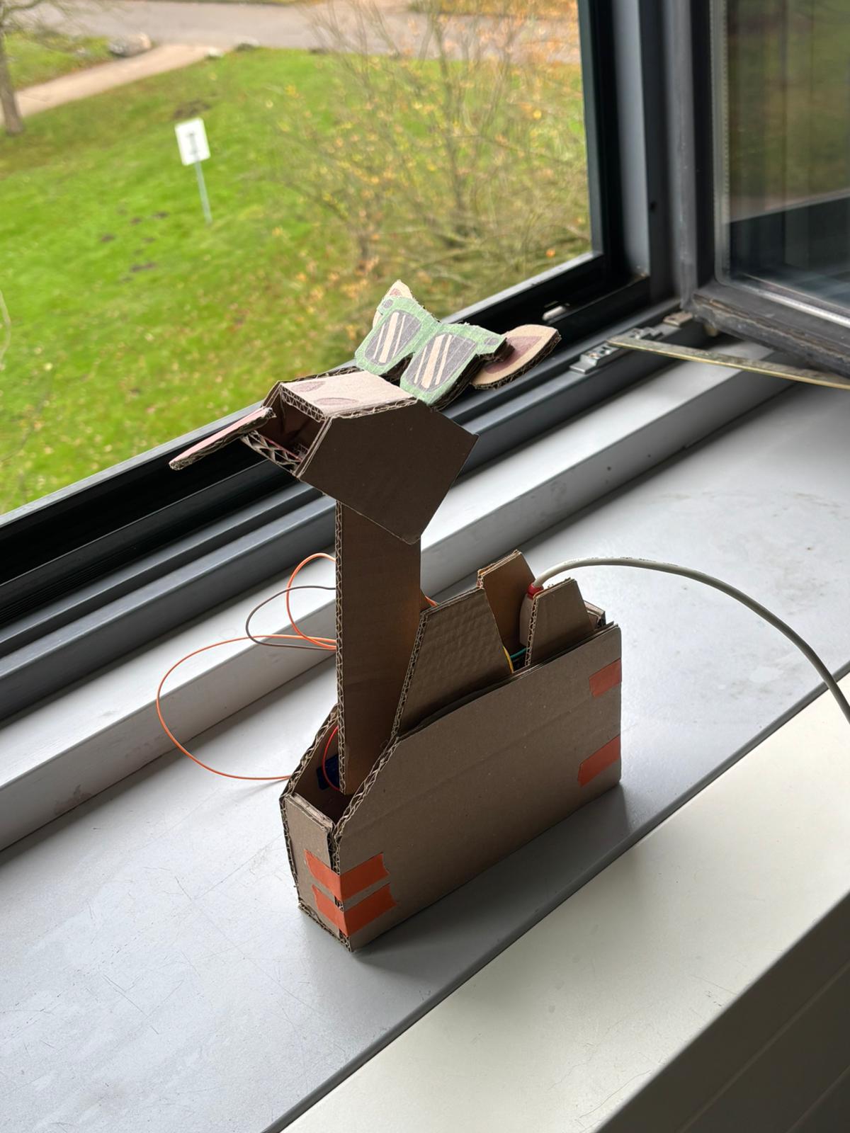 Den Microcontroller haben wir so programmiert, dass er auf Temperaturschwankungen im Raumtemperaturbereich reagiert. Der Kopf ist im 120 Grad Winkel drehbar und bewegt sich bei kälteren Temperaturen weiter nach oben, weswegen wir ihn in einem unserer Fotos am offenen Fenster positioniert haben. Auf diese Weise war es leicht starke Temperaturschwankungen zu testen.