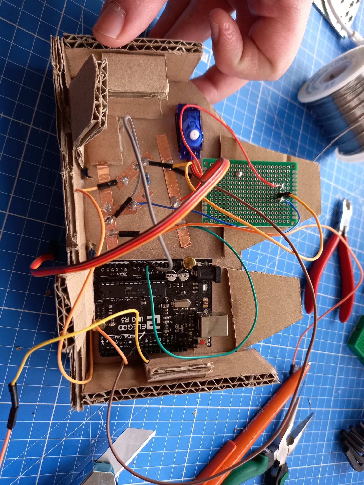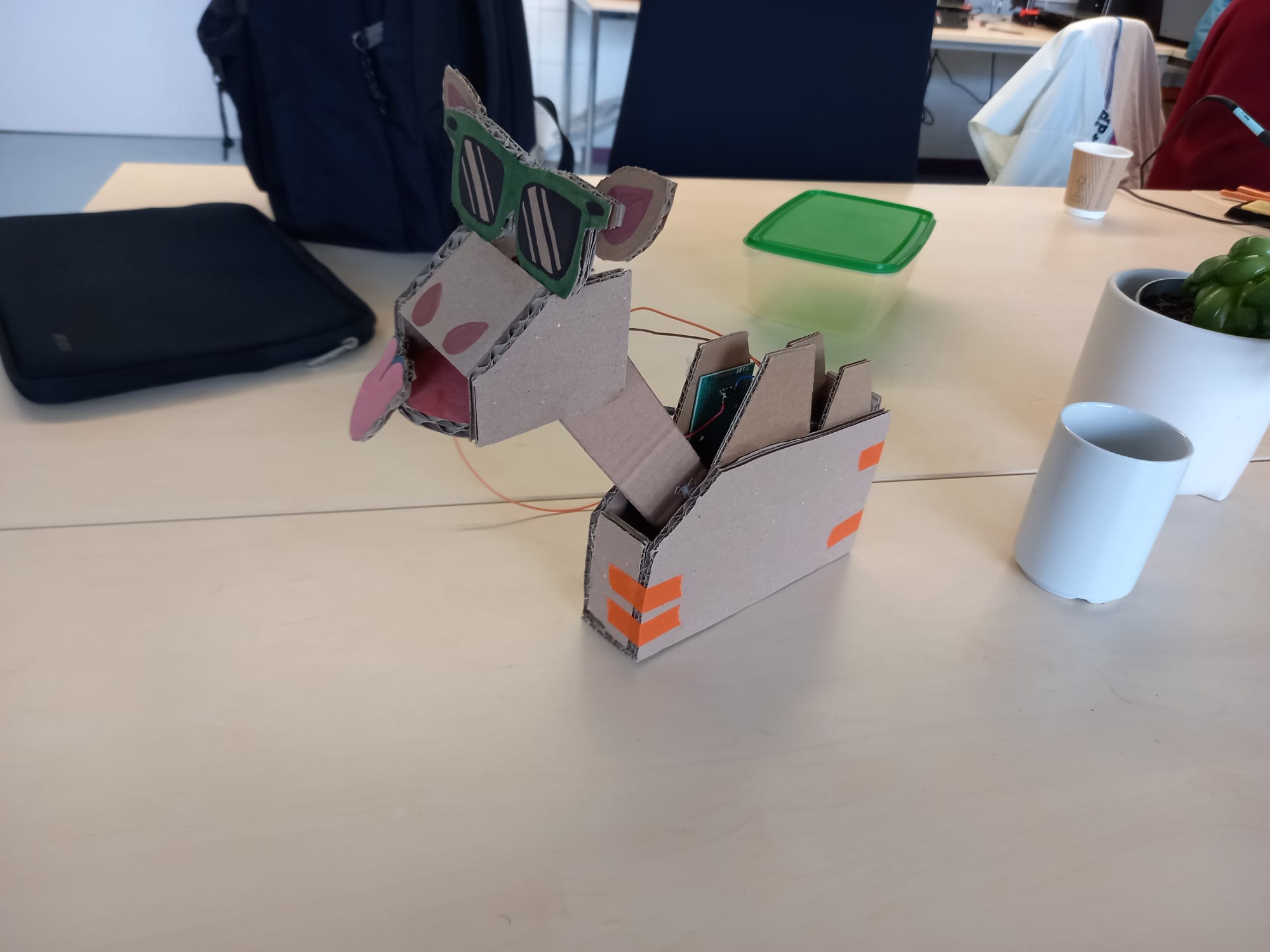 Für das Thema “Make something that reacts” haben wir uns für einen Papp-Prototypen in Form eines Kamels entschieden, welches mithilfe eines Microcontrollers, eines Temperaturmessers und eines kleinen Motors dynamisch seinen Kopf je nach Raumtemperatur bewegen kann.