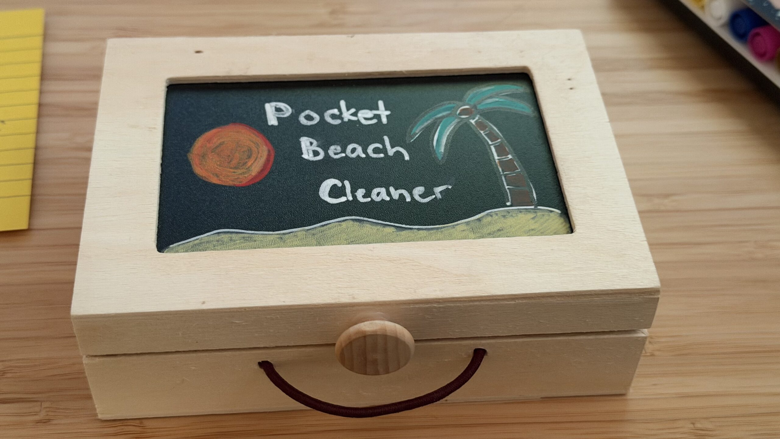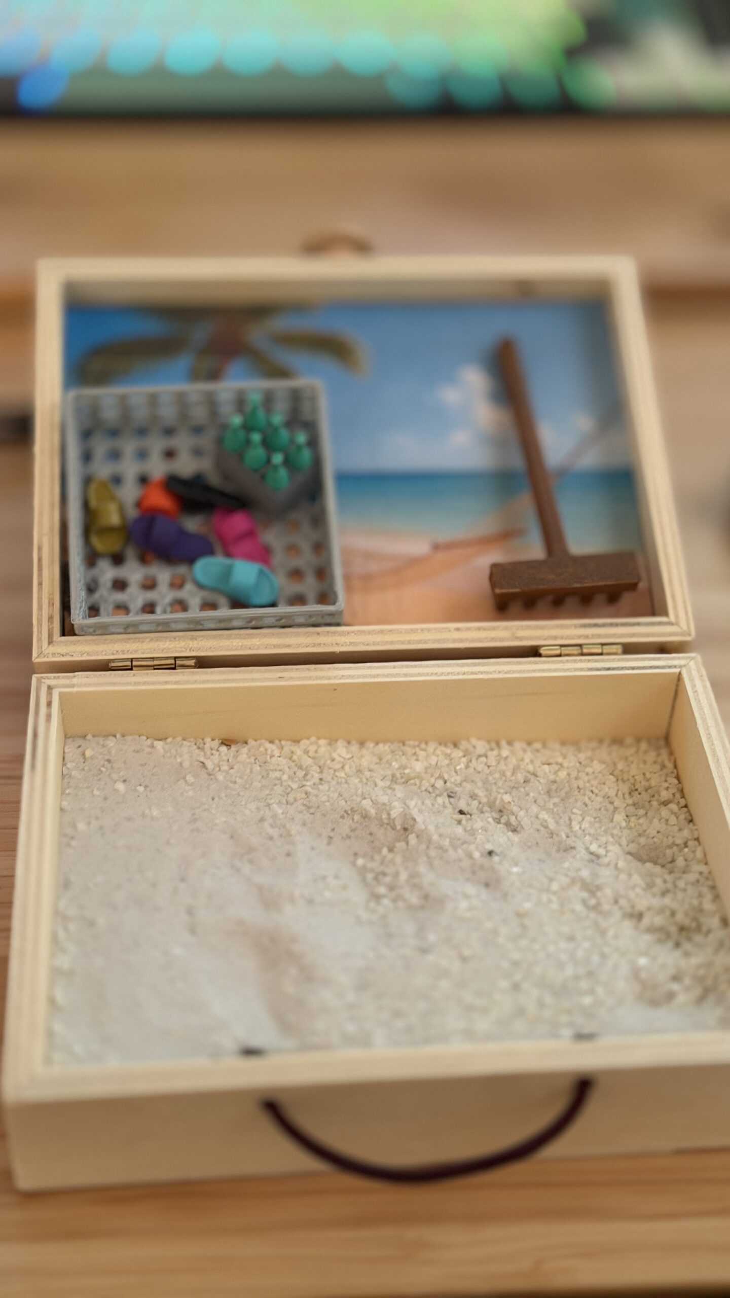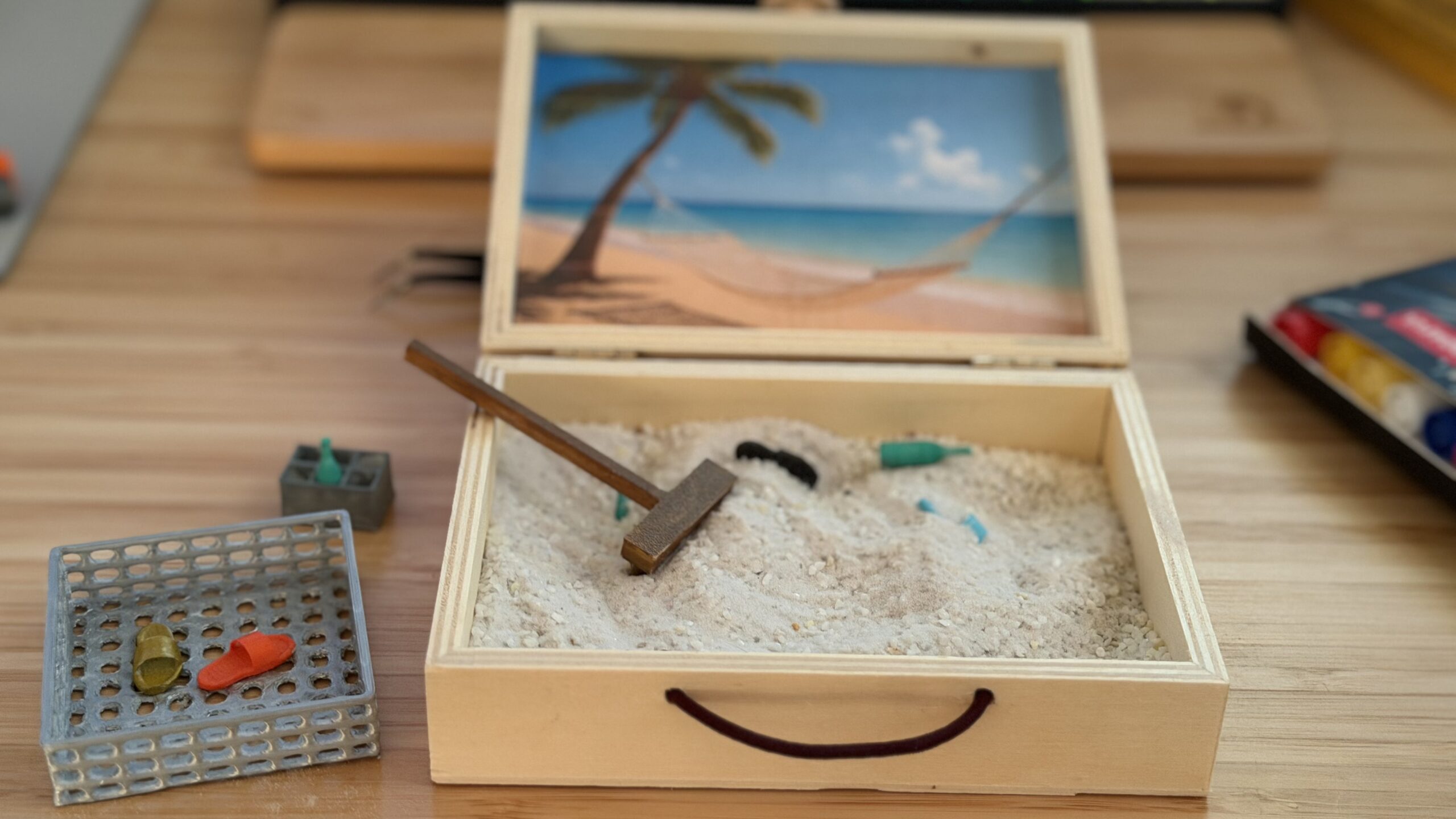 Unser Grundgerüst ist eine ungenutzte, verschließbare Holzbox, deren Deckel wir mit Acrylstiften beschriftet haben. Im Inneren klebt ein KI-generiertes Strandbild mit Hängematte – quasi Urlaub to go. Danach haben wir die Box mit feinem, hellem Sand befüllt und für die Extraportion Urlaubsflair etwas Kokosgranulat untergemischt. Kleiner Tipp: Es riecht mehr nach „Achtung, gesundheitsschädlich“ als nach „Karibik“.