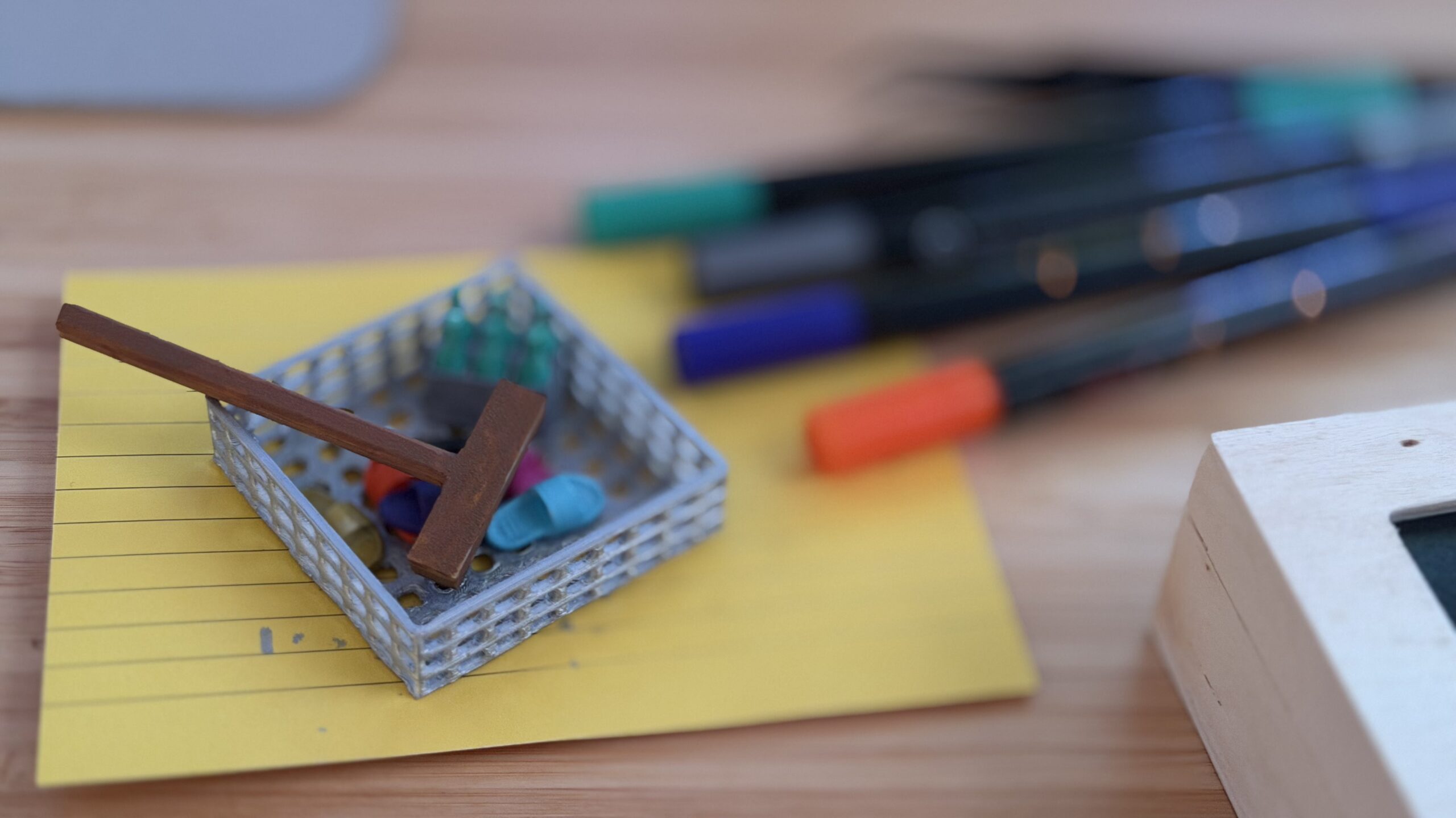 Für die Challenge „Make something calming“ sind wir erstaunlich schnell bei der Idee eines Miniatur-Zen-Gartens gelandet – nur eben anders. Der allererste Ansatz, ein Miniatur-Katzenklo, wurde nach kurzer Diskussion als eher mittelmäßig entspannend eingestuft.
