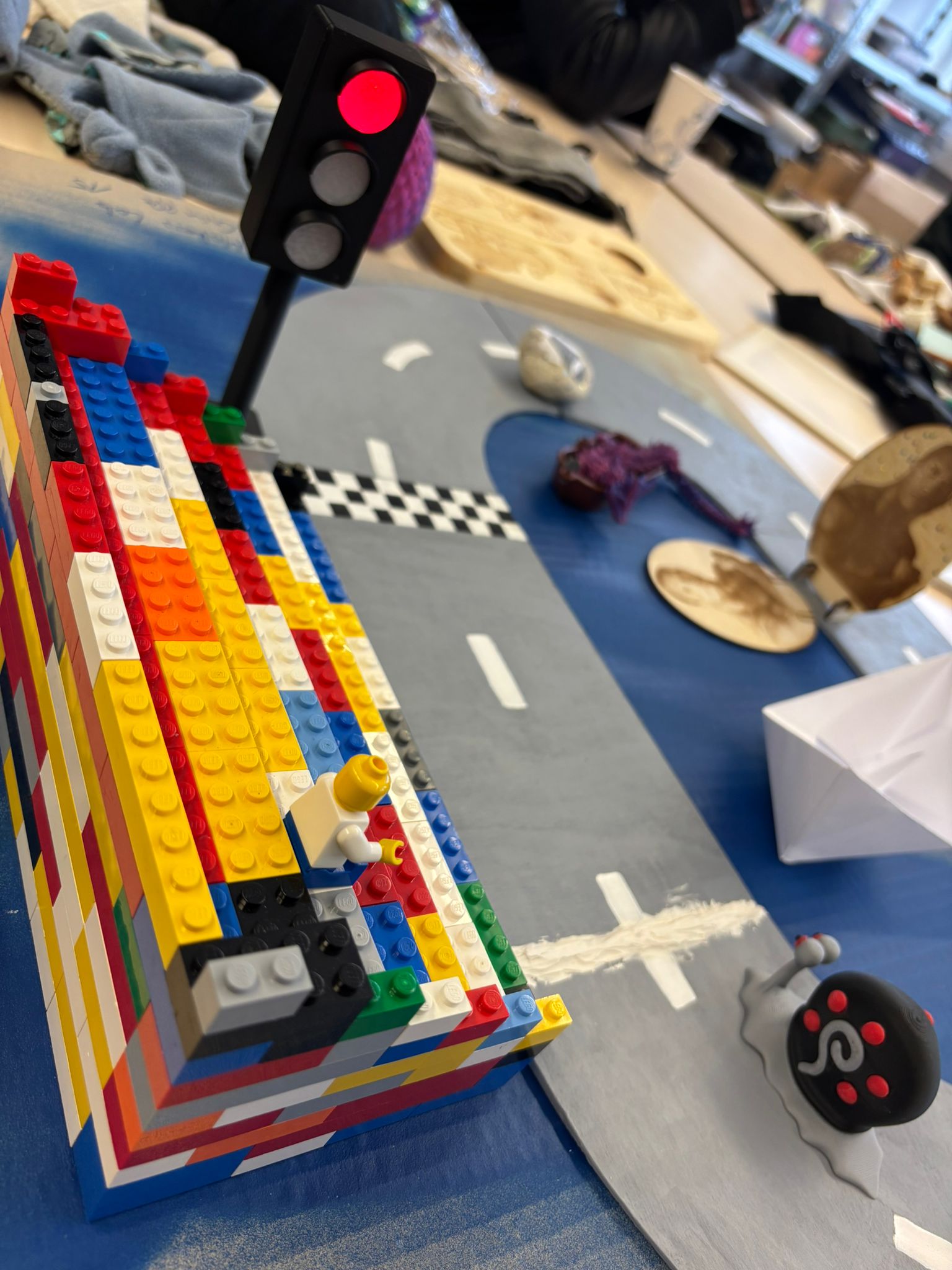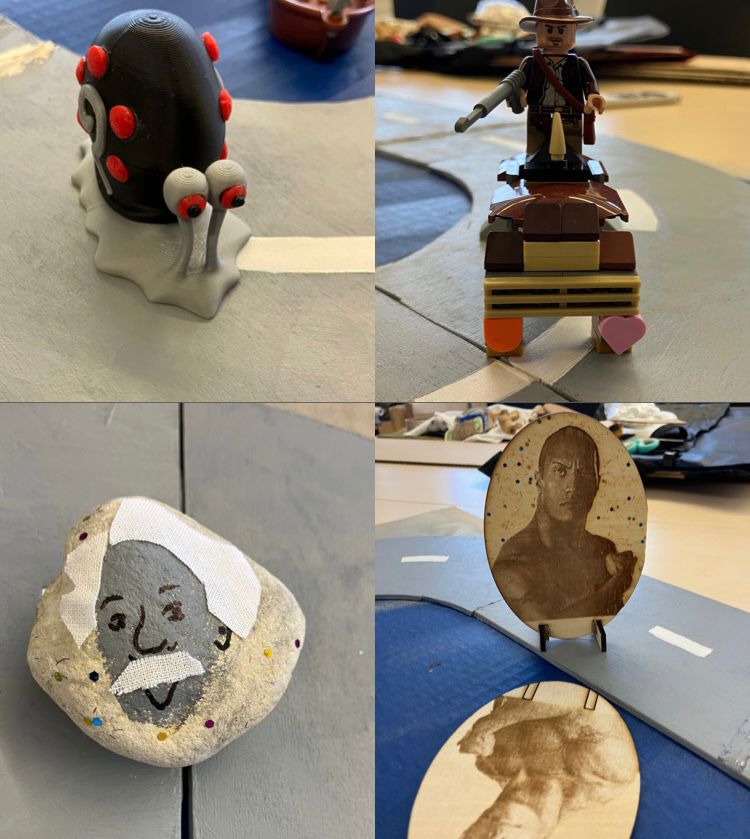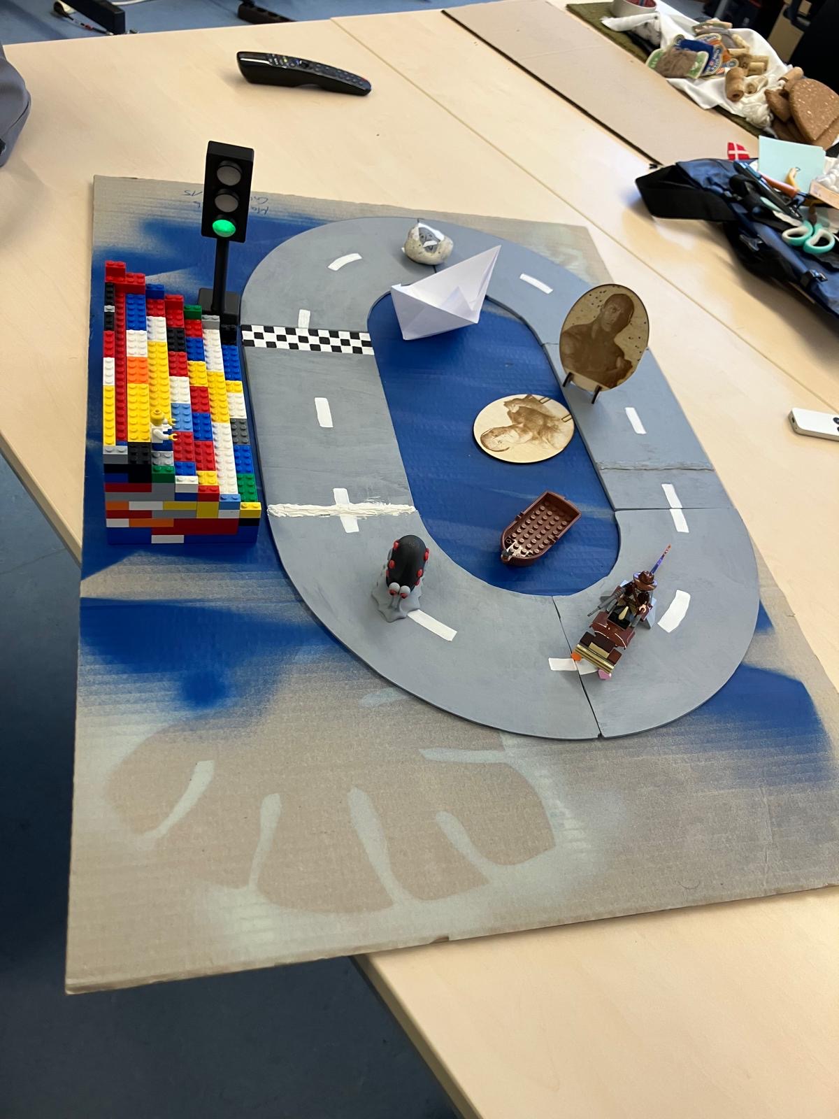 Die Rennbahn selbst wurde mit dem Lasercutter ausgeschnitten und final mit der Stichsäge ausgesägt und mit Acrylfarbe bemalt. An der Start-/Ziellinie wurde noch eine 3D-gedruckte Ampel platziert, welche über einen Microcontroller gesteuert wird. Die Ampel wird über eine Tasterfläche aus Kupferfolie eingeschaltet und schaltet initial auf Rot, dann Gelb und nach einer zufälligen Zeit auf Grün. Die Stromversorgung findet unter der Tribüne statt.