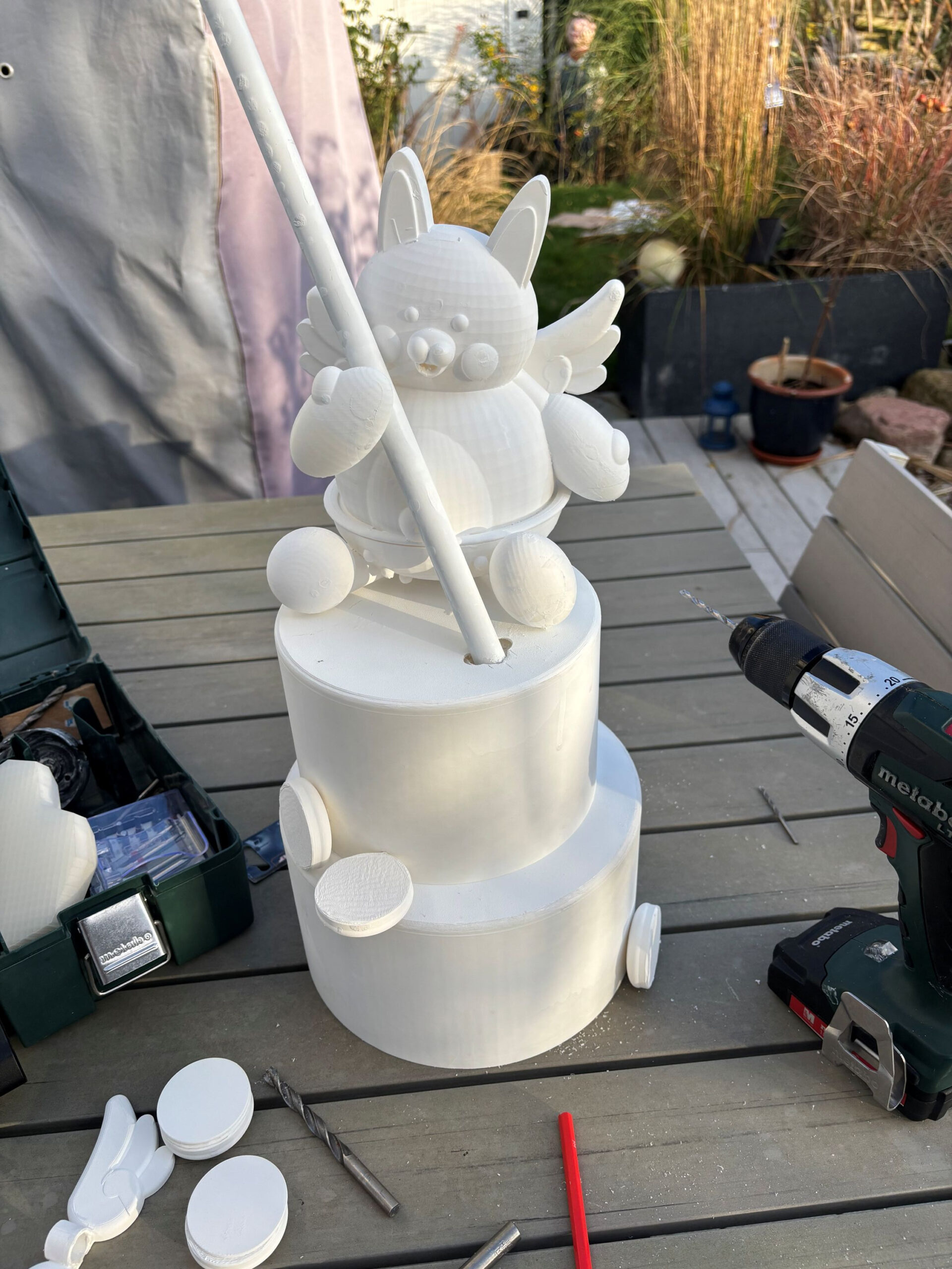Das gesamte technische Innenleben liegt in der hohlen Hochzeitstorte verstaut, wo längere Kabel durch den hohlen Stab hindurch gefädelt wurden, um das Ringlicht im oberen Aufsatz des Zauberstabs zu erreichen.