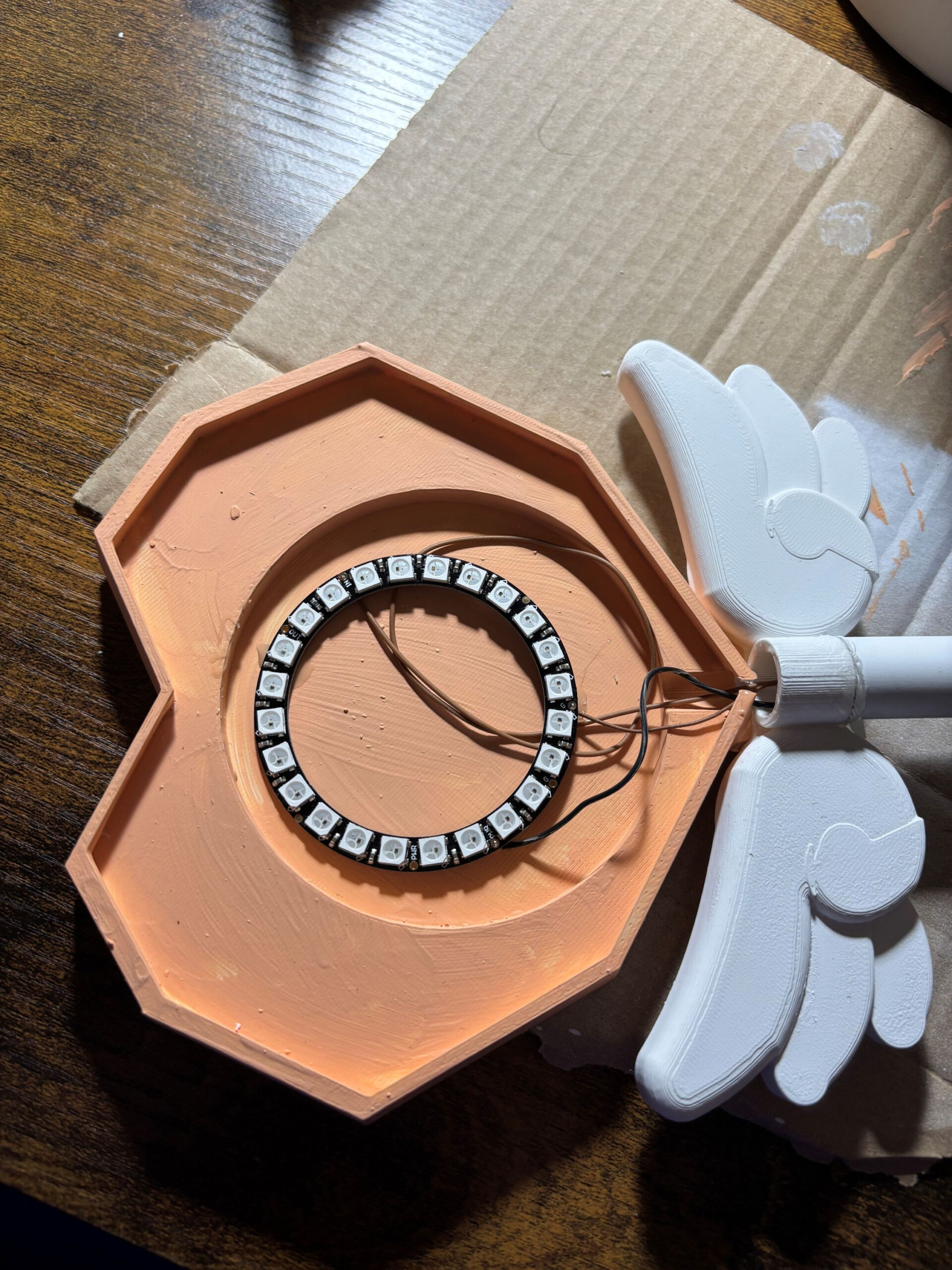 Fast alle Einzelteile der Lampe wurden mit weißem Filament gedruckt, mit weißem Primer übersprüht und mit Acryl Farben bemalt. Einzig das Herz am oberen Ende des Zauberstabs wurde mit durchsichtigem Filament gedruckt, um bestmöglich das Licht durchzulassen. Als Nebeneffekt werden die starken LEDs auch durch die Dicke des Herzens gedimmt, um so im Dunkeln eine angenehmeren Eindruck zu vermitteln.