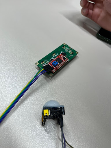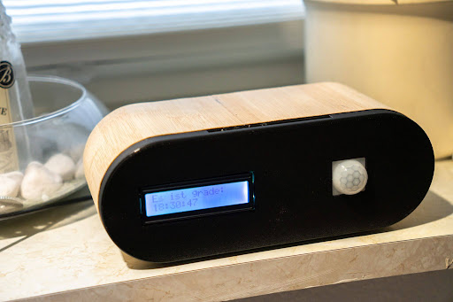 Zunächst wurden die Hardwarekomponenten verbunden, gelötet und programmiert. Auf dem LCD-Display wird die aktuelle Uhrzeit angezeigt, die über die Time-Bibliothek per WLAN abgerufen wird. Sobald der Bewegungssensor eine Bewegung wahrnimmt, springt die Uhrzeit auf eine zufällige Uhrzeit. Der Sensor wird über zwei Stellschrauben eingestellt: eine für die “Sichtweite” und eine für die Dauer des Aktivierungssignals des Sensors.