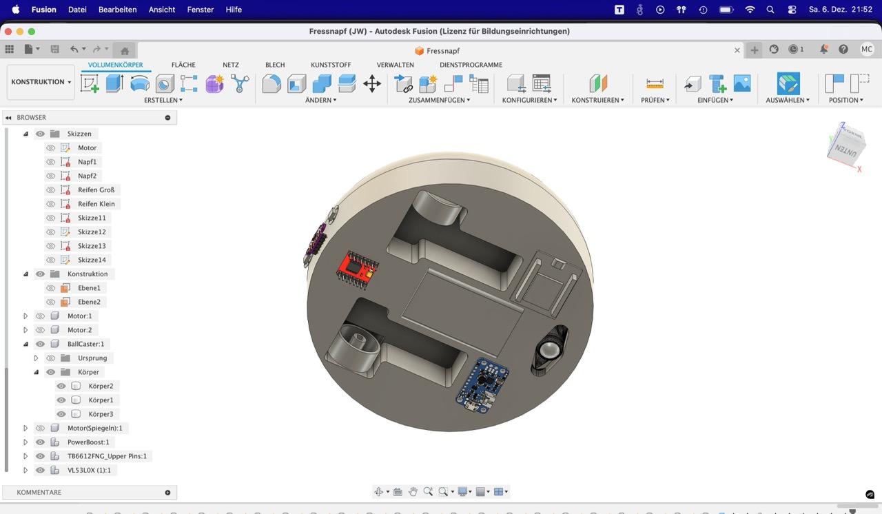 Die beiden Motoren können separat gesteuert werden, was in Kombination mit der Kugelrolle eine freie Bewegung des Napfes ermöglicht, inspiriert von einem Staubsaugerroboter.
