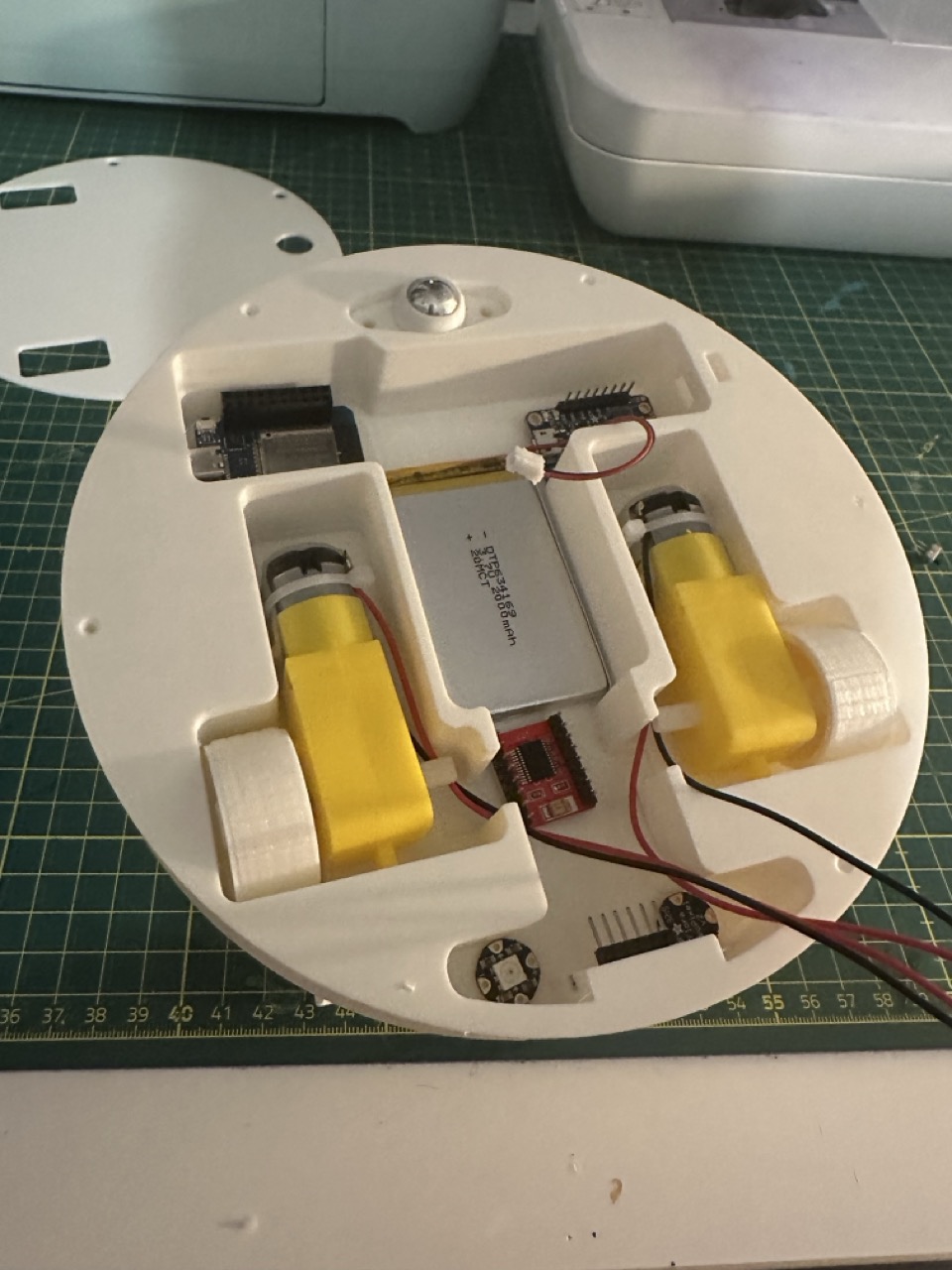 Nach dem Schleifen wurde ein Primer aufgetragen und eine Skizze erstellt, um festzulegen, wie es nachher bemalt werden soll. Das Modell wurde anschließend mit Acrylfarbe bemalt und mit Klarlack versiegelt. Danach folgte der elektronische Aufbau. Ein DC-Getriebemotor wurde über einen TB6612FNG-Motortreiber angesteuert. Zusätzlich wurden zwei NeoPixel-LEDs für die Augen, ein VL53L0X Time-of-Flight-Sensor zur Bewegungserkennung, ein 1200 mAh Lithium-Akku, ein USB-C Lithium Battery Charger Modul sowie ein MT3608 Step-Up-Modul zur Spannungsanhebung verbaut. Als Mikrocontroller kam ein ESP32 zum Einsatz, der entsprechend programmiert wurde.