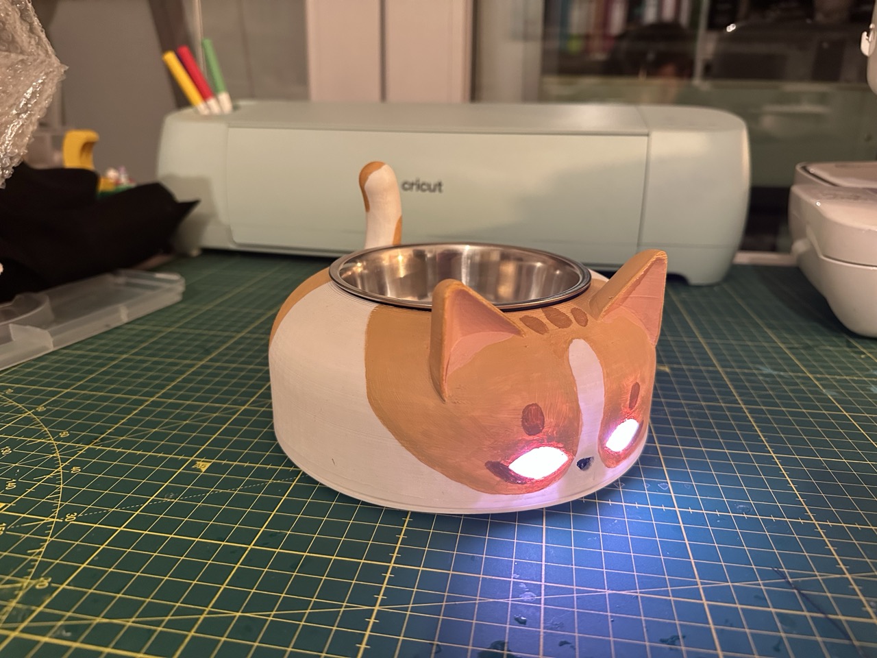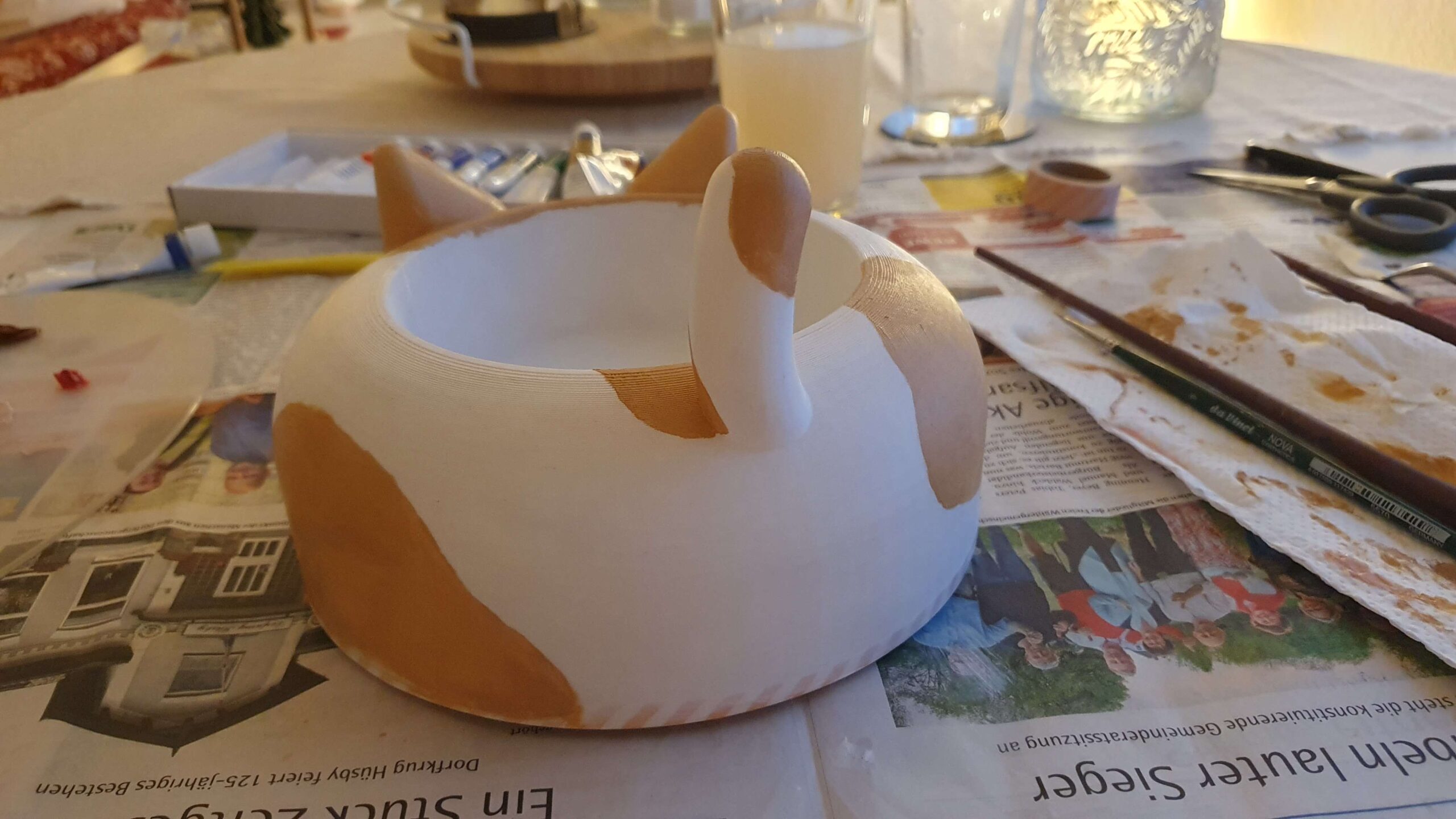 Für die finale Challenge haben wir uns dazu entschieden, möglichst viele der erlernten Techniken zu kombinieren. Um das Thema zu treffen, haben wir uns für einen dekorativen Katzennapf entschieden, der sich bei Annäherung von erkannten Objekten wegbewegt und damit bewusst nicht den eigentlichen Sinn eines Napfes erfüllt.
